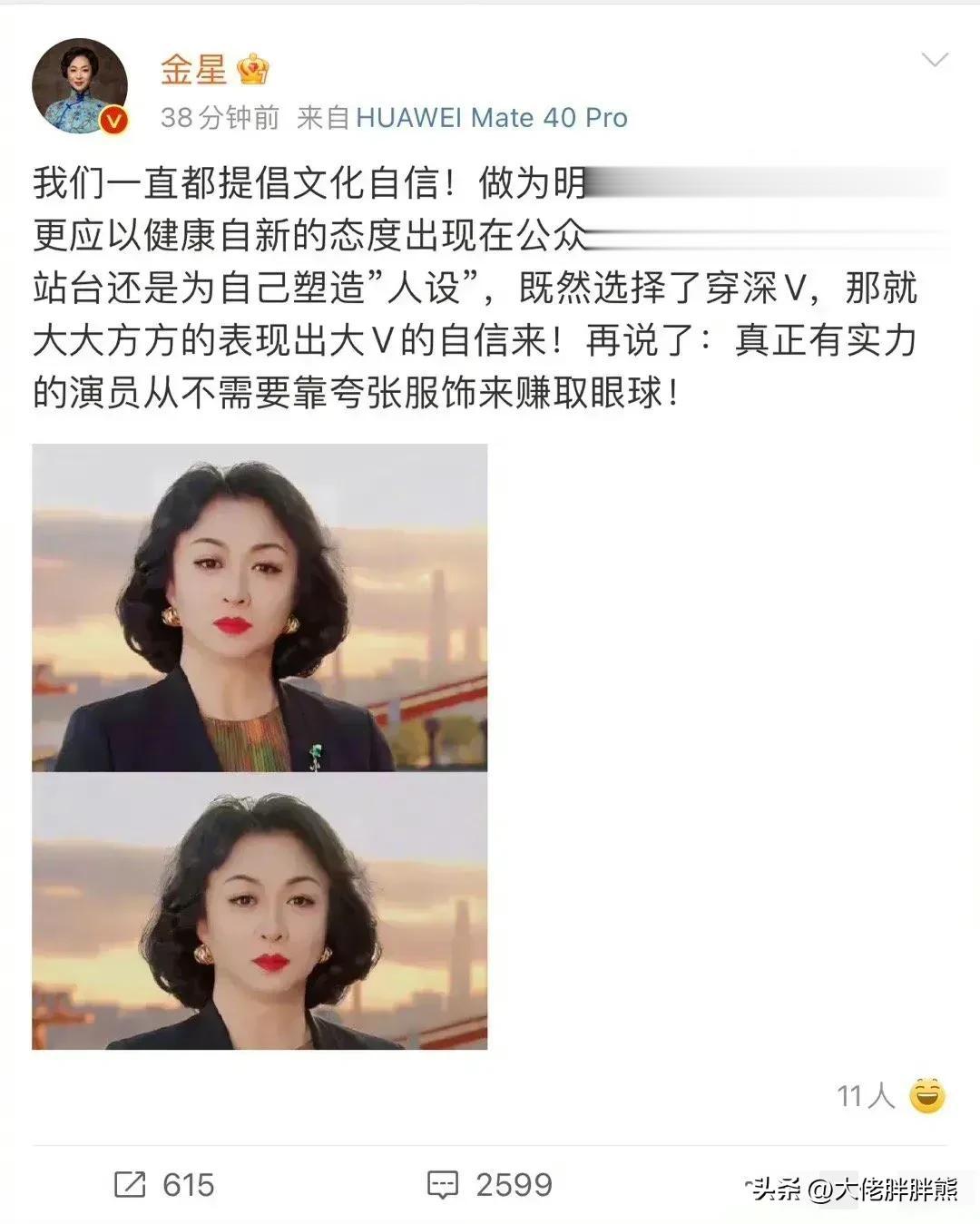 金星,拒不认错! 7月4日,金星在一次直播中对某女星走红毯时的行为进行了痛斥。 这位女星明明穿着暴露的礼服,却假装保守地捂着胸口,金星的批评引发了广大网友的关注和讨论。虽然闹剧已经平息,但金星却拒不认错,甚至直接喊话某些艺人,指责他们缺乏文化自信,认为真正有实力的演员不需要靠夸张的服饰来赚取眼球。 在网友的谩骂之下,金星再次发文炮轰某女星。 她认为,明星艺人和公众人物更应该以健康自信的态度出现在公众面前。无论是为品牌代言还是为自己塑造形象,如果选择穿深V领的衣服,就应该大方地展示出自己的自信。 然而,也有网友质疑金星的言论。 他们认为穿衣服是个人自由,与文化自信没有必然联系。甚至有人直接喊话金星,称她既没有违反国家法律,也没有违背社会道德和职业准则,更没有侵犯他人合法权益。他们认为,艺人在拍照时大方,担心走光才会捂胸离场,并指责金星过于干涉他人的自由。 然而,也有人支持金星的观点。他们认为金星她是真实的自我。 如果选择穿着性感的衣服,就应该毫不犹豫地展示出来。比如像倪妮一样,每次走红毯时都特别自信,而相比之下,迪丽热巴显得有些拘谨。 关于金星的观点是否正确,这是一个多元化的问题,各有不同的看法。无论怎样,这场事件都引发了对于公众人物形象的思考。在当下,文化自信成为了一个备受关注的话题。每个人都应该有自己的审美标准和价值观,而穿衣打扮也是个人表达自我风格的一种方式。 在娱乐圈中,演员们的形象,还有公众形象是密不可分。他们的言行举止会直接影响到粉丝和观众对他们的认知和评价。因此,对于公众人物来说,展现健康自信的形象是非常重要的。 我个人认为,金星说的没错,本来就是,穿出自信可以否,不要扭捏,何必这样?说她不自信吧步伐却很妖娆,说她自信吧,不是一只手捂就是两只手捂,又穿又捂是挺矛盾的。 既然要穿,为什么要捂着?如果说弯腰捂着还可以理解,正常走路为什么要捂着,要保守就不要穿着暴露嘛! 当然了,无论是金星还是其他公众人物,在发表观点时都应该尊重他人选择的自由,不过度干涉他人的生活方式。每个人都有权利选择自己的穿衣风格和形象,只要不违反法律和道德,就应该被尊重和接纳。大家觉得是不是这样呢?