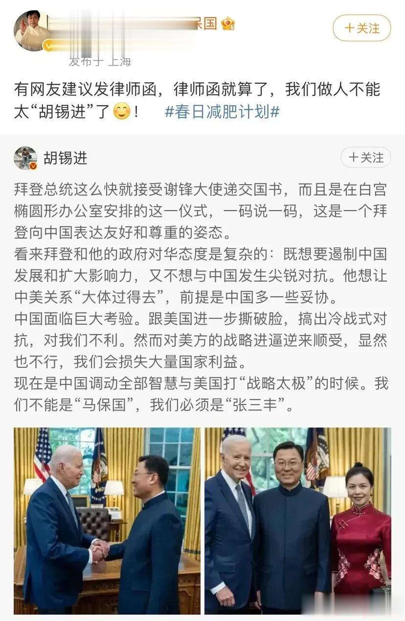 胡锡进和马保国的"太极"对决?谁胜谁输…… 胡锡进大V在谈到中美关系时点名了马保国,直接引发了一场关于智慧与战略的讨论。 而马保国也没有示弱,转发了胡锡进的发言,并且回怼称我们不能太"胡锡进"。 胡锡进和马保国这一番对话引发了不少网友的关注。毕竟,胡锡进作为大V,对于马保国的点名实在有些过分。 马保国可是大家口中的"兄长",被调侃已久,此时再被同龄人胡锡进拿出来"当众嘲笑",实在有点过分了。尤其是胡锡进曾经在马保国被调侃时,更应该劝年轻人适可而止。 目前,胡锡进称自己正在老挝,而对于马保国的回怼,我们不知道他会有何反应。但相信大家都希望看到这场"太极"对决的延续。毕竟,两位60岁以上的大咖在微博上的互动,不仅引发了网友的热议,也让大家看到了他们之间的风采。 不得不说,这场"太极"对决的火爆程度让人意外。无论是胡锡进还是马保国,他们都是在自己领域内取得了不小的成就,各自拥有着强大的粉丝基础。而他们之间的对话也让我们看到了两位老前辈的幽默和洞察力。希望这场"太极"对决能够继续下去,给我们带来更多的欢乐和思考。 最后,无论是胡锡进还是马保国,他们都是我们值得尊敬和学习的榜样。无论是智慧还是战略,他们都在自己的领域内取得了成功,给我们树立了榜样。希望所有的年轻人都能够向他们学习,努力成为更好的自己!