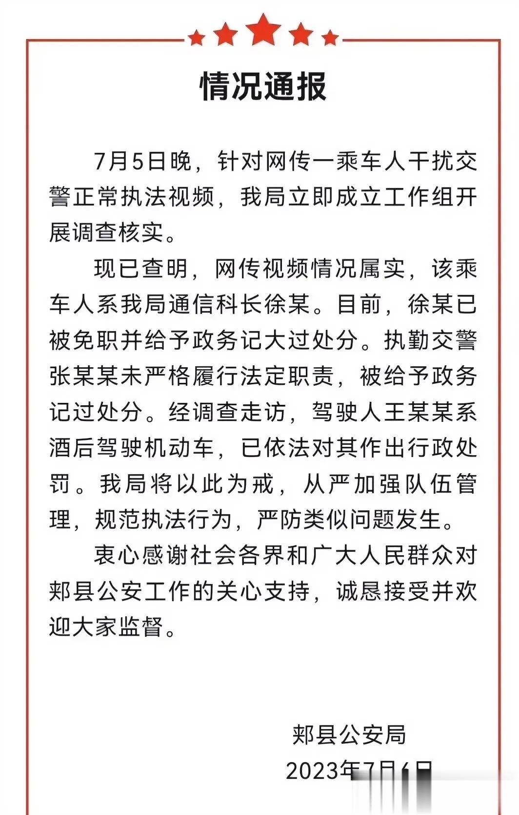 拍视频不放行的交警(辅警)已经被穿小鞋打击报复扣帽子开除了,酒驾开车的司机(酒驾开车那个)、醉酒打电话摇人开后门的警察(耍官威出洋相那个)、被打电话后被要求手下放人并要求手下放人了的交警带班(电话里那个)、被接电话被要求放人并放人了的交警(现场视频里接电话放人那个。其实视频左前方还有第三个“接电话”全程置身事外的交警),啥事儿没有。 在这个应付视听的不痛不痒的通报里,被打电话被要求放人并要求手下放人了的那个交警带班人(电话里那个),全程隐形了,啥事儿没有。被通报的三人也啥事儿没有