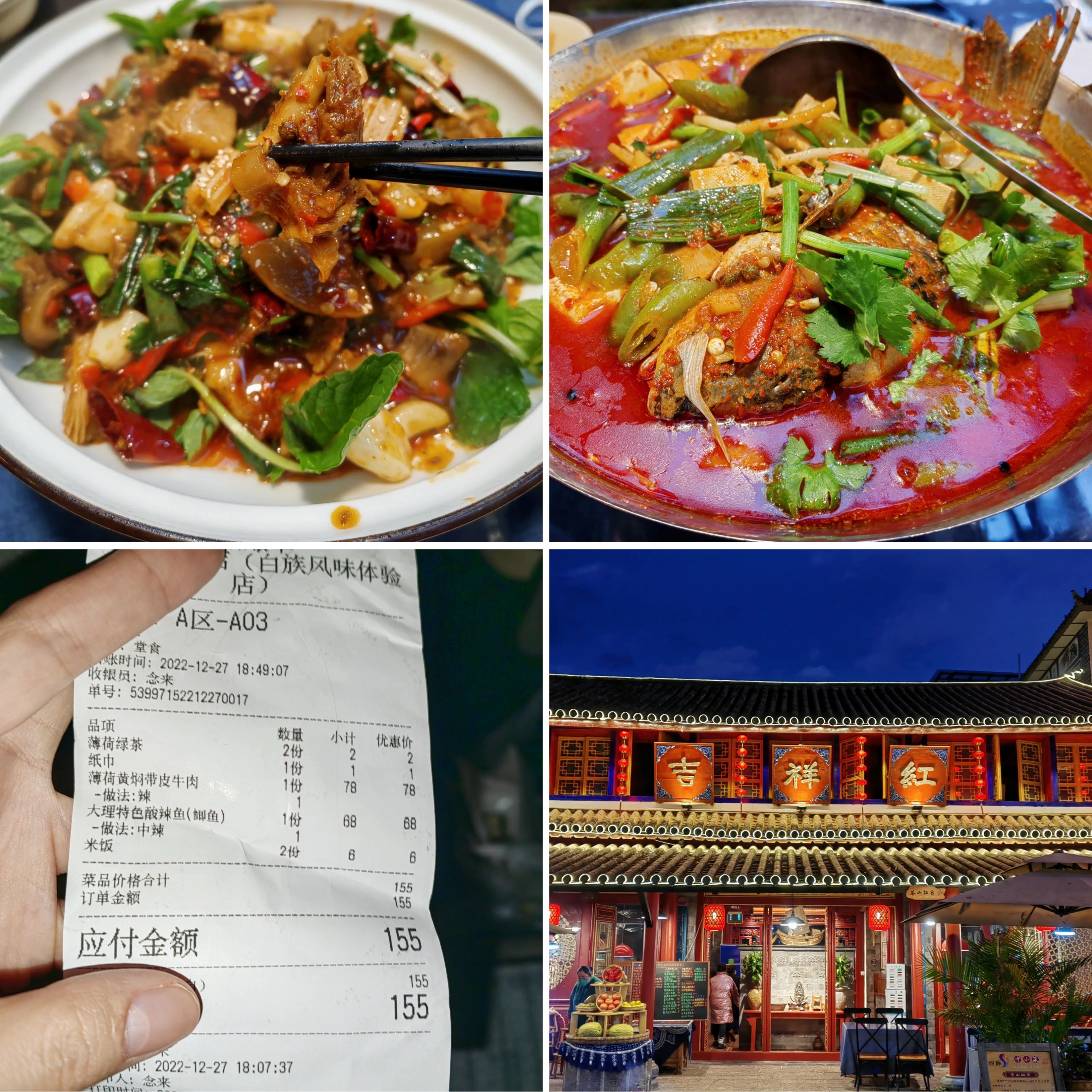 🥩美食:我吃了两家比较火🔥的店,一家是“吉祥红”,一家是“杨小厨”,都在双廊古镇。吉祥红要比杨小厨贵一点,它家的薄荷黄焖牛肉一绝,俺重庆人很爱,牛肉入味下饭,薄荷解腻。杨小厨的也好吃,汽锅鸡很鲜。