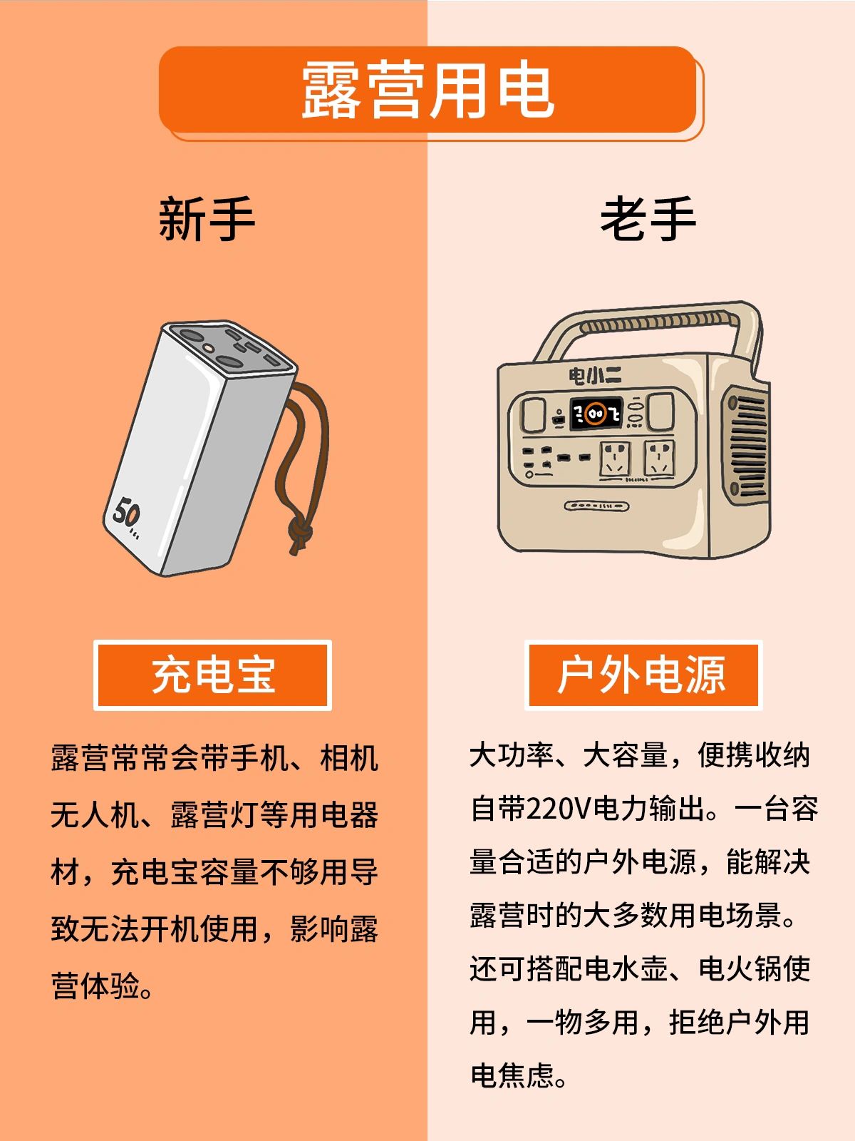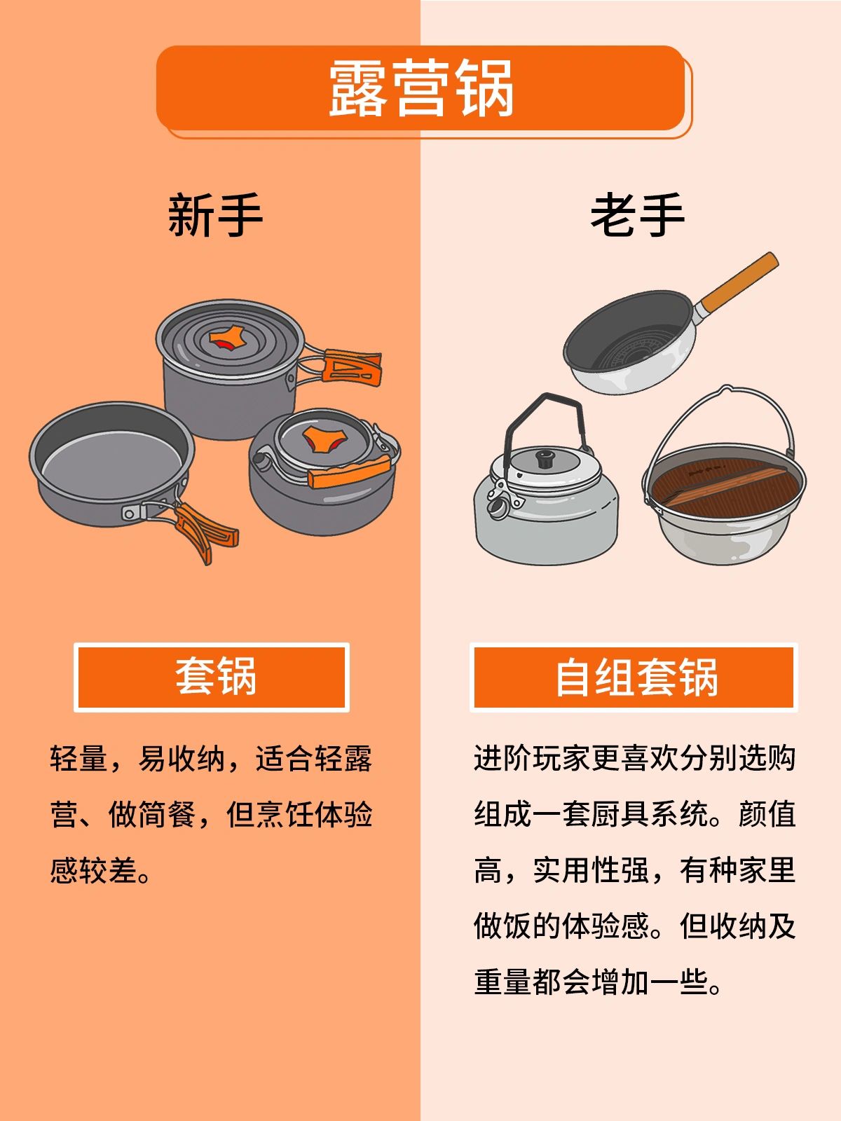 入坑露营第一件事就是买装备啦,来看看露营小白和露营老手的装备有什么区别吧!看完举手♂你属于哪一类?·1露营桌新手蛋卷桌颜值高,实用性强,材质分为木质或铝合金,新手露营必入的一件装备之一。老手IGT桌可单独使用,集成户外炉具;也可多桌面拼接,集成更大的桌面系统。进阶玩家选购较多,实用性更强,可玩性更高。·2露营椅新手克米特椅颜值高、坐感佳、性价比高,新手露营必入的一件装备之一。收纳后呈四方型,体积相对较大。老手海狗椅面料抗撕裂、透气性好,坐感舒适、承重能力优,进阶玩家入手较多。折叠呈长条状,更适合收纳、携带。面料抗撕裂、透气性更好。·3露营锅新手套锅轻量,易收纳,适合轻露营、做简餐,但烹饪体验感较差。老手自组套锅进阶玩家更喜欢分别选购,组成一套厨具系统。颜值高,实用性强,有种家里做饭的体验感。但收纳及重量都会增加一些。·4露营用电新手充电宝露营常常会带手机、相机、无人机、露营灯等用电器材,充电宝容量不够用,导致无法开机使用,影响露营体验。老手户外电源大功率、大容量,便携收纳,自带220V电力输出。一台容量合适的户外电源,能解决露营时的大多数用电场景。还可搭配电水壶、电火锅使用,一物多用,拒绝户外用电焦虑。·5露营桶新手水桶露营必备装备之一,容量大,带出水口,使用方便。老手冰桶颜值高,一物多用。平时可做储水桶,也可储存冰块、冷藏食物。