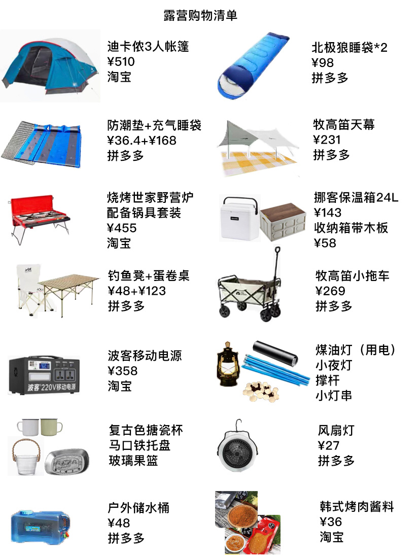风扇灯:绝绝子,挂在帐篷内的顶上,即可以照明也可以吹风(强推)餐具:搪瓷杯加水果篮加广口铁托盘储水桶:买可视化的水桶,可以看到水量韩式烤肉酱:青瓦台,和韩式烤肉店一样的味道,可以放心冲