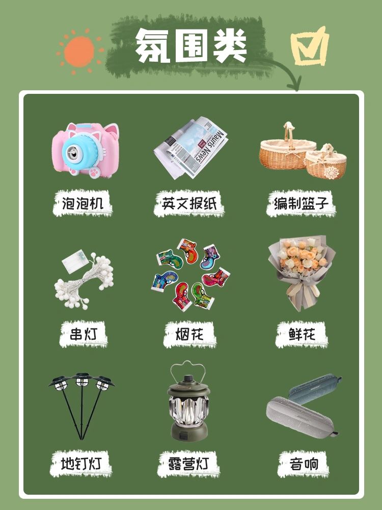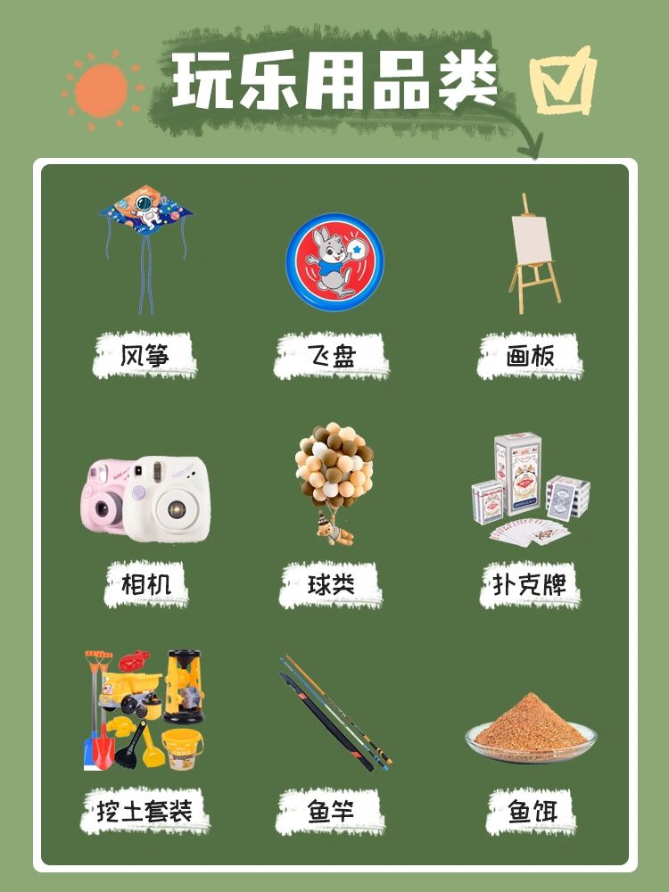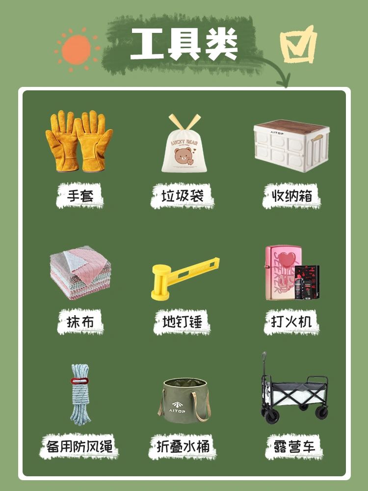 一.睡眠类: 1.帐篷(比起天幕私密性、舒适性更强)2.奶酪垫3.野餐垫4.吊床(睡个午觉很舒服)5.折叠床6.充气床垫7.充气枕头(很小不占空间)8.露营毯(夏天晚上当被子就够了)9.防潮垫(对于潮湿的地方很有必要) 二.炊具类: 1.卡式炉2.烧烤炉(人多建议选这个)3.烤盘4.餐具套组5.气罐(个人建议多带几瓶以防不够)6.木炭(好几次出门发现没带炭)7.湿纸巾8.刀具套装9.调料(烧烤必不可少啦) 三.氛围类: 1.泡泡机(拍照非常出片)2.英文报纸3.编织篮子4.串灯(晚间挂在天幕上_超级温暖)5.地钉灯6.露营灯7.烟花(晚间拍照绝绝子)8.鲜花9.音响(露营怎么不能来点音乐呢) 四.急救类:1.创口贴(出去肯定会磕磕碰碰啦)2.酒精棉3.蚊香(户外蚊虫真的Hin多)4.止痛药5.花露水6.防晒霜7.藿香正气水(夏天最好包里常备奥)8.退烧药(昼夜温差大_难免感冒)9.绷带 五.玩乐用品类:1.风筝(如果树木太多就不建议带啦)2.飞盘3.挖土套装4.画板5.球类6.鱼竿(在河边必备的鱼竿)7.鱼饵8.扑克牌9.相机(想拍出美美的照片必不可少) 六.工具类:1.手套2.垃圾袋(建议宝子们都能无痕露营)3.收纳箱4.地钉锤(上次没带找的大石头)5.备用防风绳6.折叠水桶7.打火机8.抹布(无论做饭还是啥都需要)9.露营车