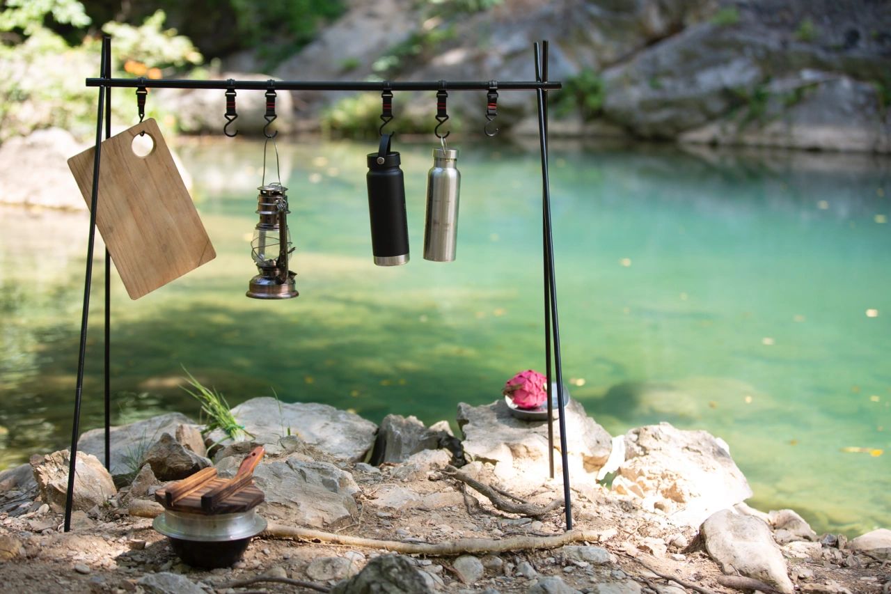 门形的置物架一般可以固定在露营桌上,相当于拓展了桌面空间。小的折叠置物架,也适合放置桌面,增加桌面的立体感,同时能够放置更多小物品。