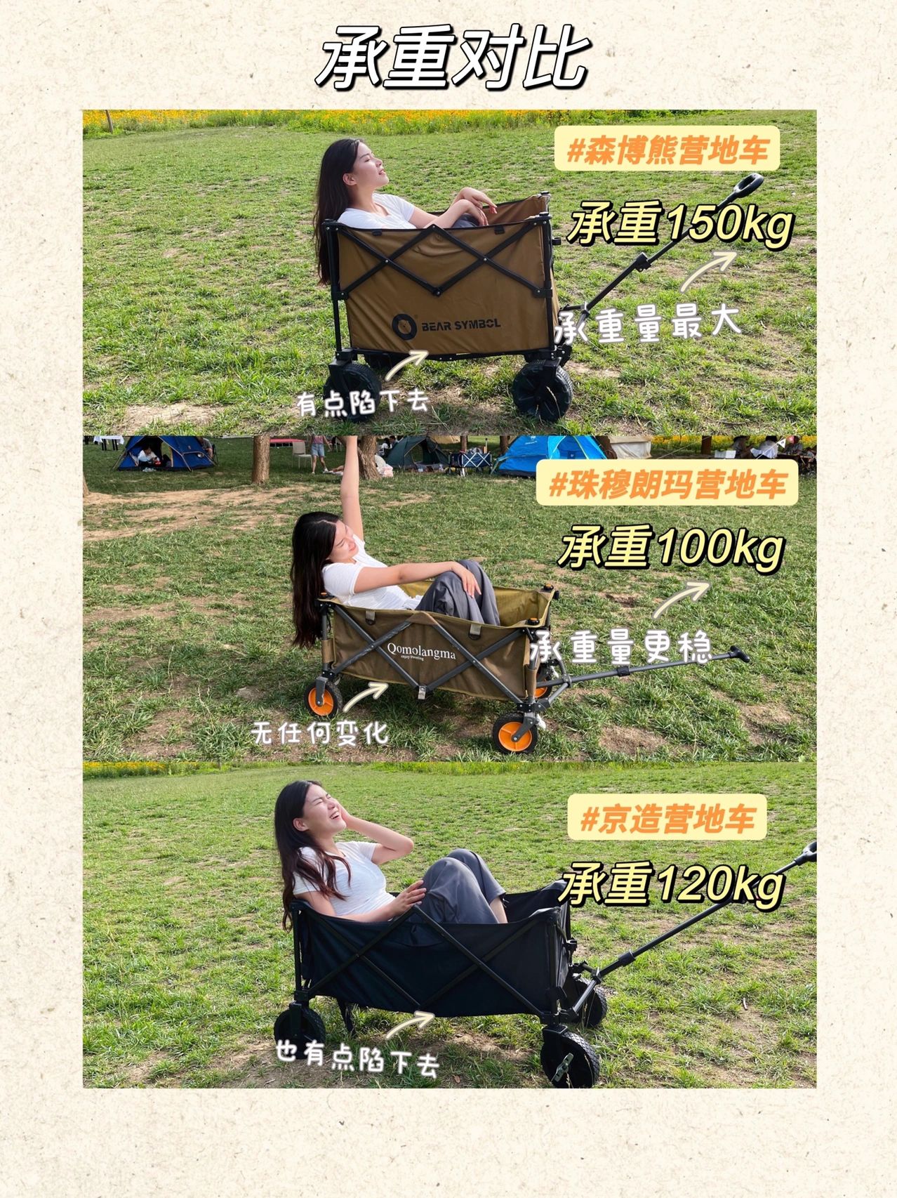 1森博熊::729耐脏的卡其色,加高的车身,标志性的大轮胎,转向特别顺滑。深度大于其他两款营地车,装载容量超过180L,拉两趟的东西一趟就能搞定,承重为150KG,我100多斤,坐进去有一点陷下去,但是影响不大,后盾由PE吹塑轮优质钢架组成。600D牛津布面料,防泼水、耐磨、抗撕裂,整个内兜可以拆卸,随时可以清洗,非常方便。收纳很方便,不占地方,功能性也很强,可以配小桌板,一秒可以变成小餐桌。虽然价格相对于其他两款有点贵,但是真的很不错!