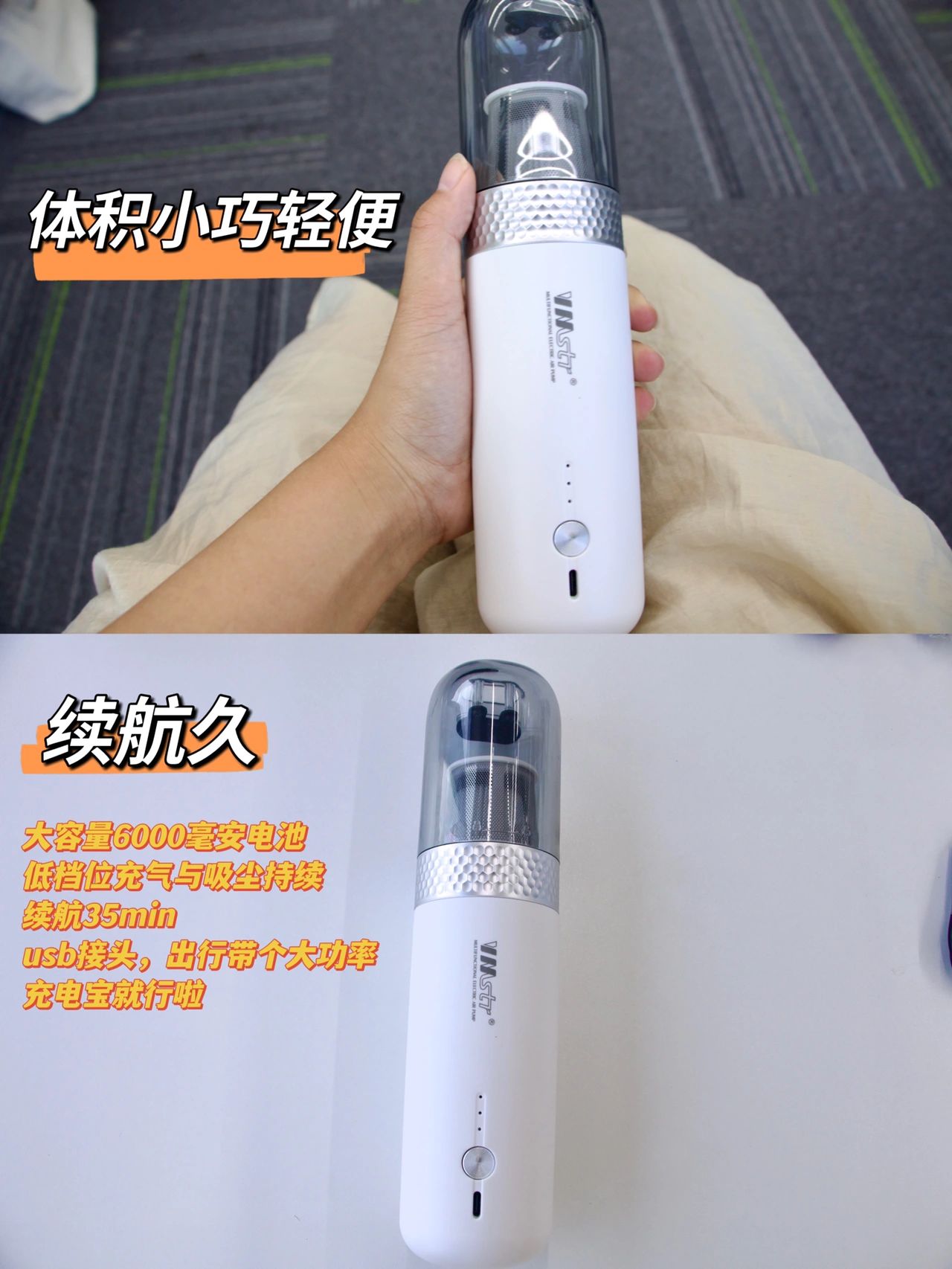 使用感受,体积小巧轻便续航久,大容量6000毫安电池,低档位充气与吸尘持续续航35分钟,usb充电头充电,出行带个大功率充电宝就行啦,带吸尘功能,立省一个无线吸尘器的钱配件多,各种型号接口满足不同需求收纳方便,配的收纳包质量也很棒功率巨猛17000pa,无论充气抽气还是吸尘,速度很快,劲也很大,冲抽充气枕头、游泳圈、奶酪垫毫无压力317000pa与4500pa之间的。区别电机不同高功率的(17000pa)电机是无刷电机,12V供电,转速高,风量大,充气更快,压力大充气更快更饱和。