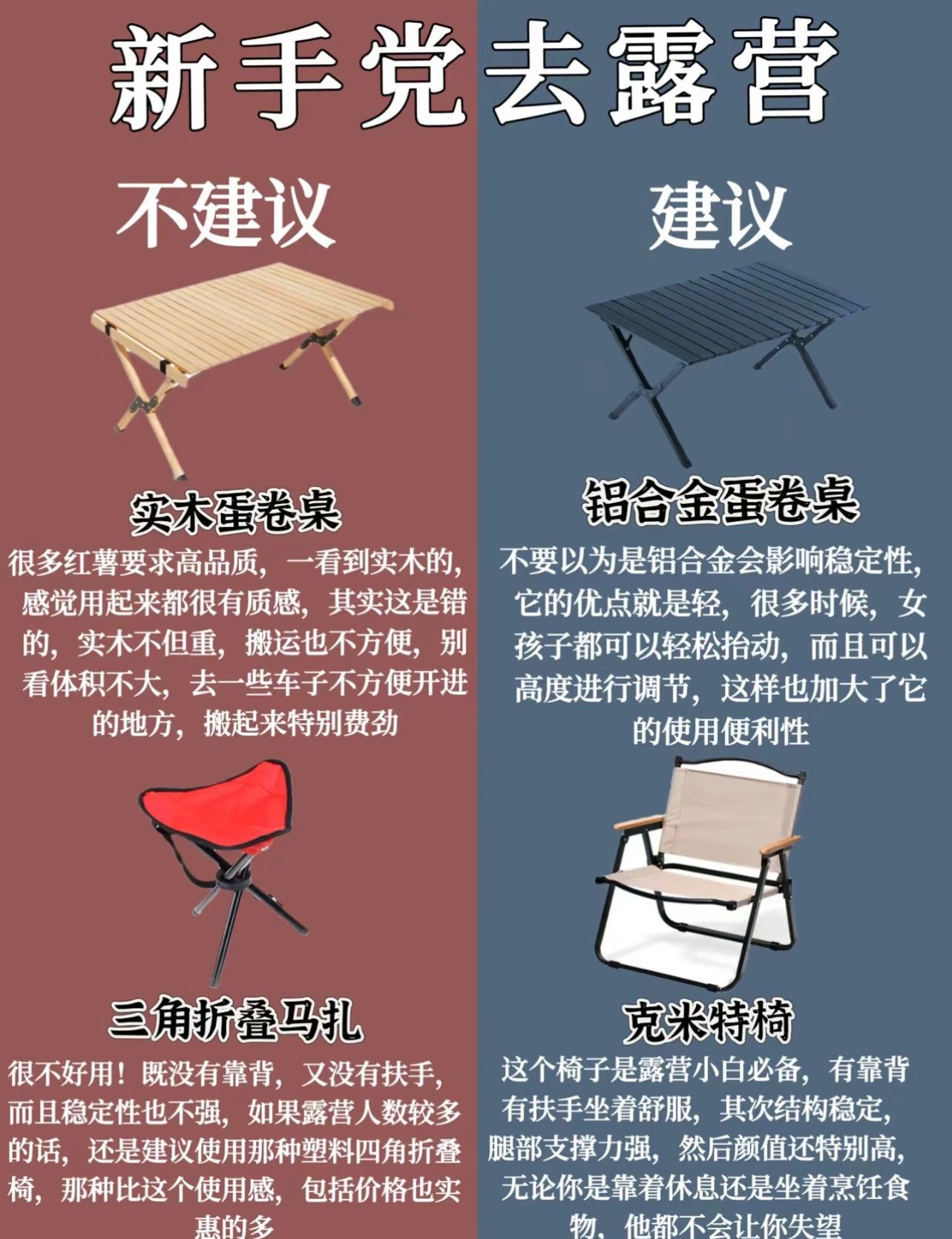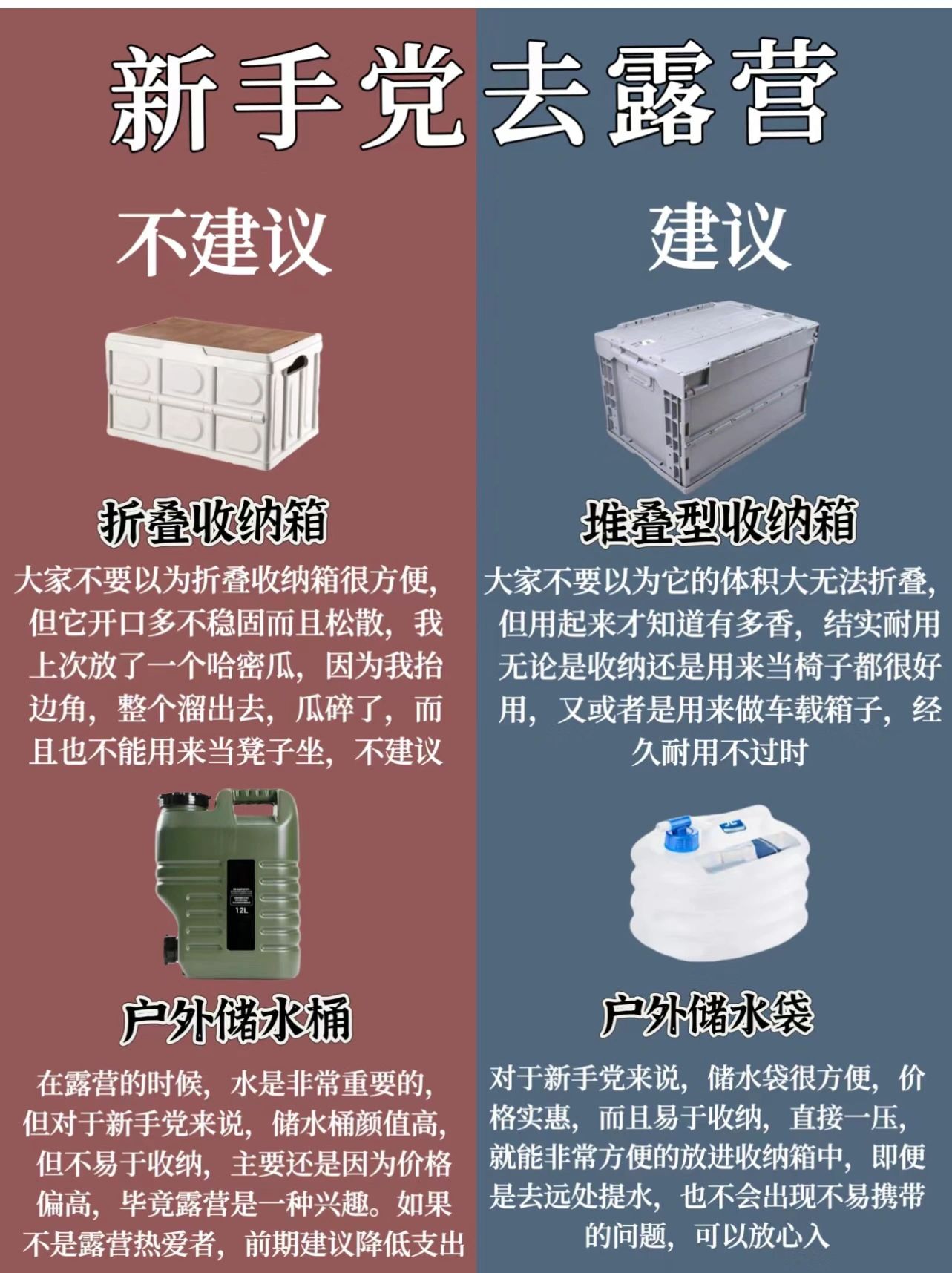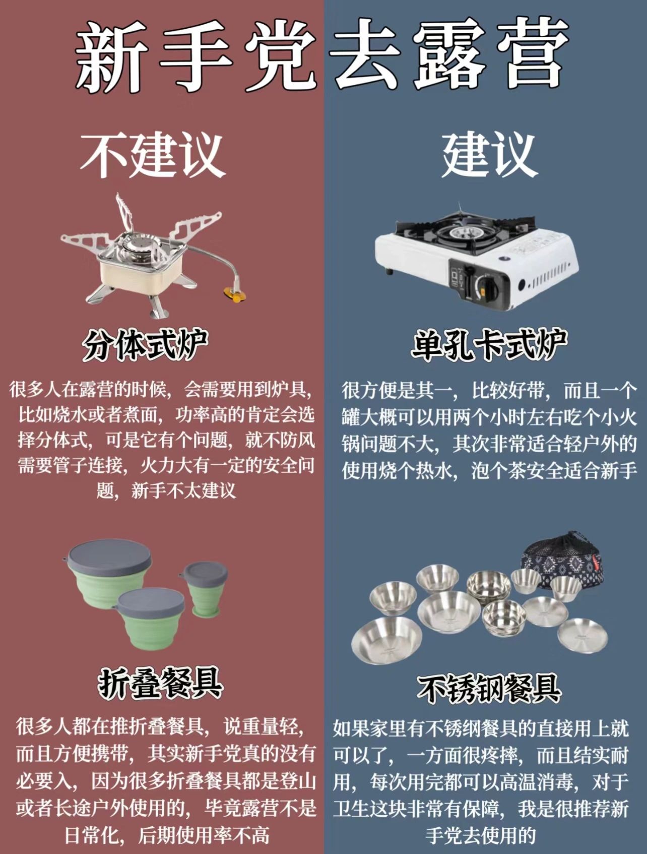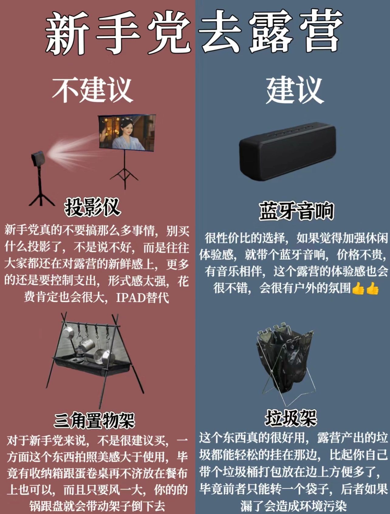 一、新手党不建议入的10件露营装备1﹣帐篷(夏天可不入)2﹣平折式营地车3﹣实木蛋卷桌4﹣三角折叠马扎5﹣投影仪6﹣三角置物架7﹣折叠收纳箱8﹣户外储水桶9﹣分体式炉10﹣折叠餐具二、新手党放心入的10件露营装备1﹣天幕2﹣四向折叠式营地车3﹣铝合金蛋卷桌4﹣克米特椅5﹣蓝牙音响6﹣垃圾架_7﹣堆叠型收纳箱8﹣户外储水袋9﹣单孔卡式炉10﹣不锈钢餐具好啦,感谢红薯们的支持记得关注收藏哟或者以选择一站式露营,好吃的好喝的好玩的统统给你安排上,解放双手,玩得更嗨