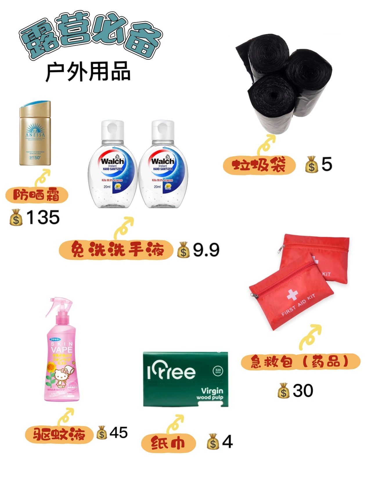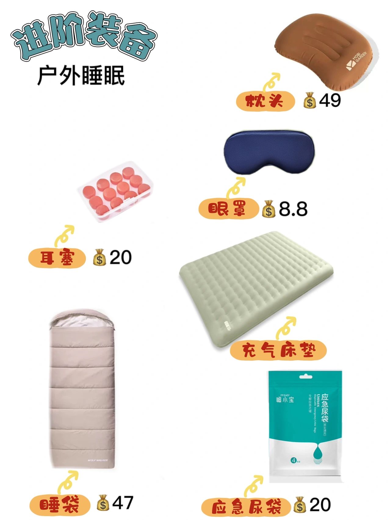 平价露营装备推荐超全高性价比建议收藏小白平价露营清单分享露营买错蕞贵这份是我踩过很多雷所总结的良心露营装备 推荐平价且齐全希望可以帮到你们,适合公园日常露营—不过夜必备1帐篷(带天幕2合1帐篷蕞合适)轻量化好收纳 2地布(放在帐篷下面)隔脏隔湿 3防潮垫:垫在帐篷内底部4野餐垫:公园露营必备(驱蚊水、防晒霜、露营帽、墨镜、防晒衣、免洗洗手液、垃圾袋)选配5天幕6蛋卷桌7折叠椅8蓝牙音箱· 适合营地露营—过夜基础装备1帐篷2天幕3折叠椅4蛋卷桌5地布6防潮垫7野餐垫·户外厨具1户外套锅(平底锅+烧水壶+汤锅)2卡司炉3气罐4烤肉盘5挡风板6餐具7户外水杯 户外睡眠1充气床垫2充气枕头3睡袋4应急尿袋5眼罩、耳塞 户外收纳1露营车太重要了不负重1秒变身蛋卷桌 2收纳袋:可装进露营车、折叠椅等。放后备箱很方便 3保温箱:重要食物一整天都不会坏 4收纳架:挂厨具、小物件很适合 5收纳箱:很能装,拍照颜值还很高 6折叠水桶:洗碗、洗菜敲方便 户外用电照明: 1露营灯:氛围感十足 2Led灯:建议选择带太阳能的夜晚太适合了,超级亮 3灯串:挂帐篷上很美 4户外电源:吃火锅,投影、打游戏 5投影仪+幕布:看剧神器、提升氛围感 6风扇:夏天很需要 户外穿搭: 1露营帽:必备,拍照好看 2雨靴:过夜露水很多、草地很湿,有了雨靴再也不怕啦 3墨镜 4防晒衣:必备 5露营背心:很有氛围感,口袋很多,在户外特别能装 户外用品: 1驱蚊水 2急救包(创口贴、碘伏、肠胃药、感冒药、风油精等) 3防晒霜 4垃圾袋 5纸巾(消毒湿纸巾)