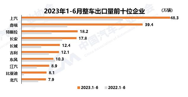 整车出口前十企业中(上半年),出口前十分别是上汽,奇瑞,特斯拉,长安,长城,吉利,东风,江汽,比亚迪,北汽