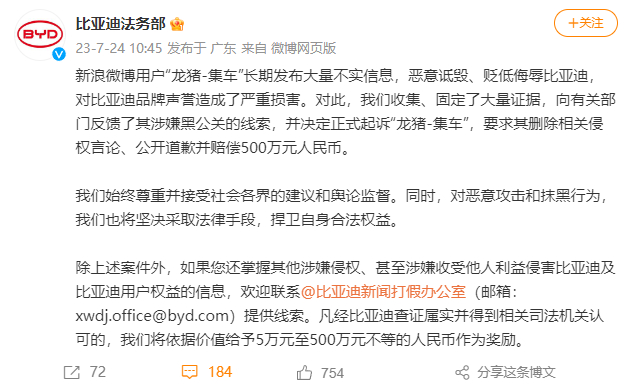 #比亚迪起诉汽车博主索赔500万#