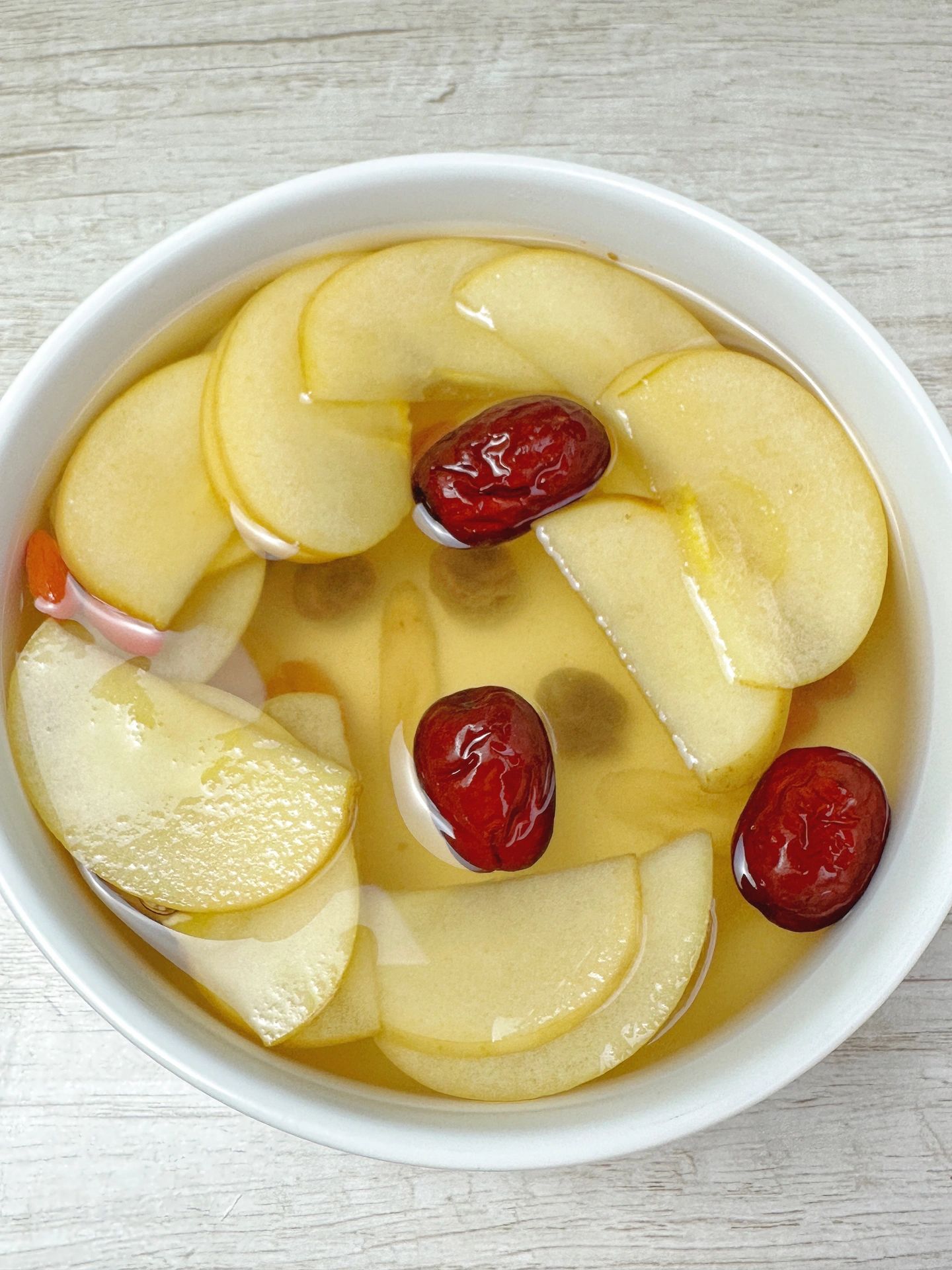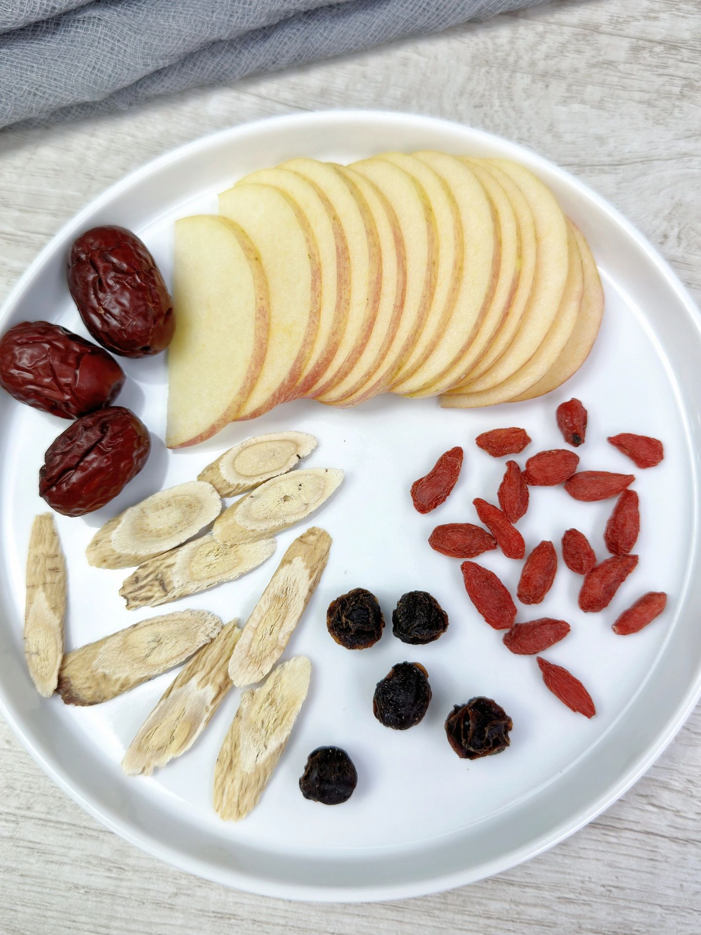 食材:苹果半个、红枣3个、枸杞20颗左右、桂圆5颗、黄芪9片