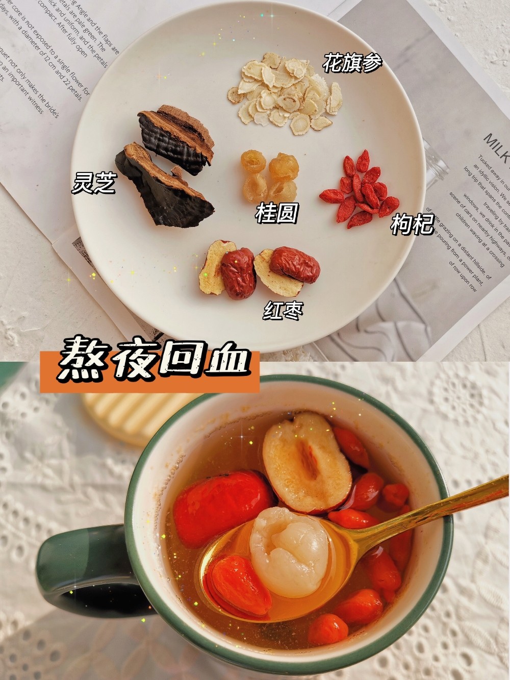 材料:桂圆6颗,红枣片10g, 麦冬3g,玉竹3g, 枸杞5g