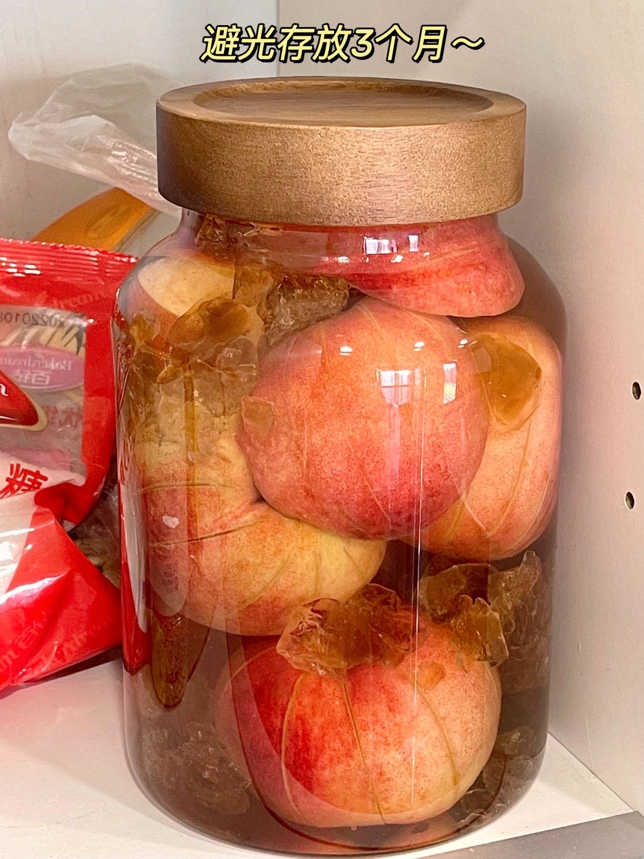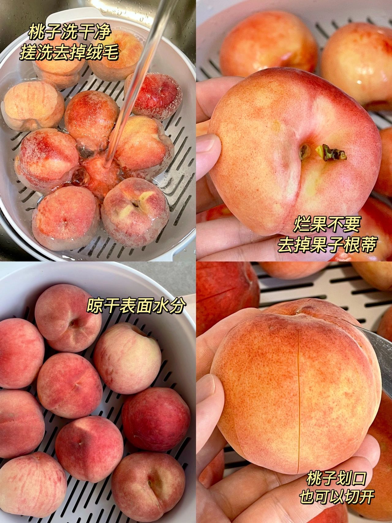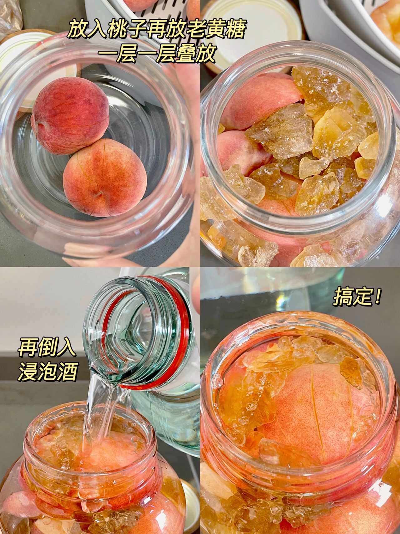 洗干净桃子晾干无水分,先放桃子一层再放一层糖,差不多满就可以倒入白酒盖上盖子就搞定了!放阴凉处避光存放3个月!!