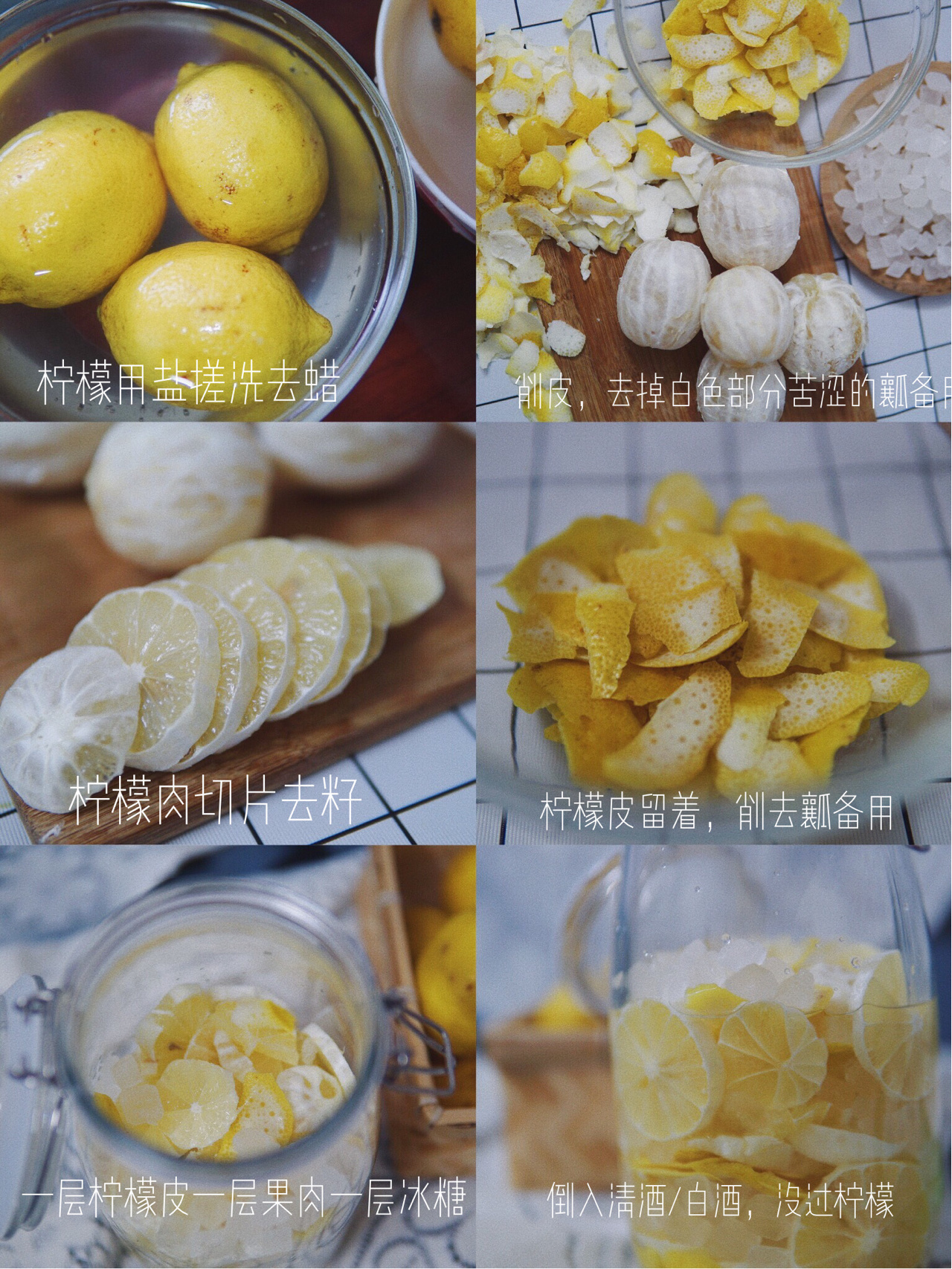 而柠檬酒的关键在于留下清新的柠檬皮,但是要去籽和去瓤,不然会很苦。用粗盐搓洗柠檬去蜡,然后削皮,接着把白色的瓤全部削掉剥干净,然后切片去籽,麻烦是麻烦了些,但是泡出来的酒真的好清新哟