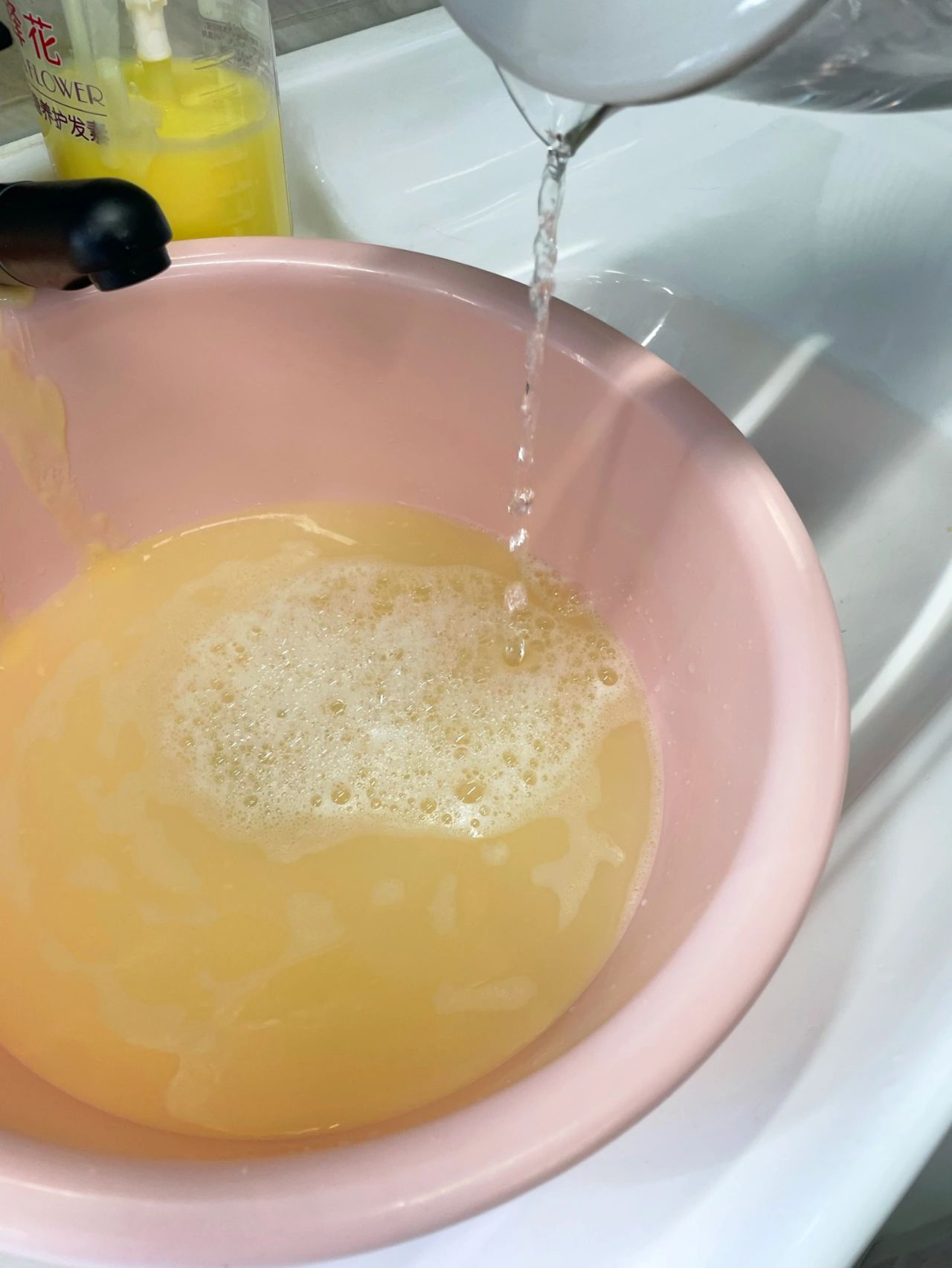 2、刚烧开的水倒在盆里,搅拌一下让护发素都融在水里,我看别人是这样做的,搅完之后掺了点凉水,要不太烫了没法洗