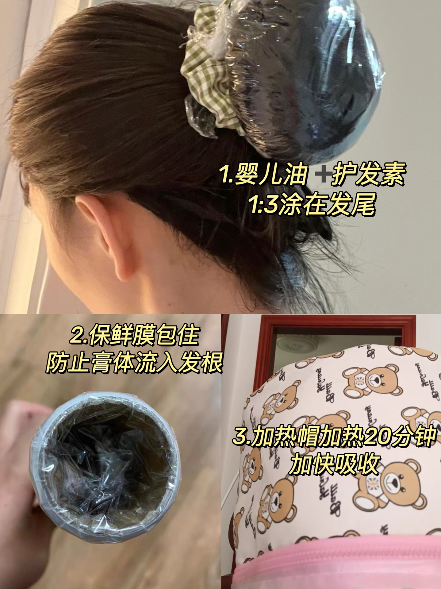 预洗还挺重要的,因为这样能在用完洗发水的情况下也不是很干燥,再去护理就会事半功倍了,我预洗的时候会加婴儿油和诗绘护发素,1:3或4都行,充分融合好之后再去涂抹发尾,用加热帽加热20分钟,充分吸收后再用护发素清洗两遍,不要让表面有残留
