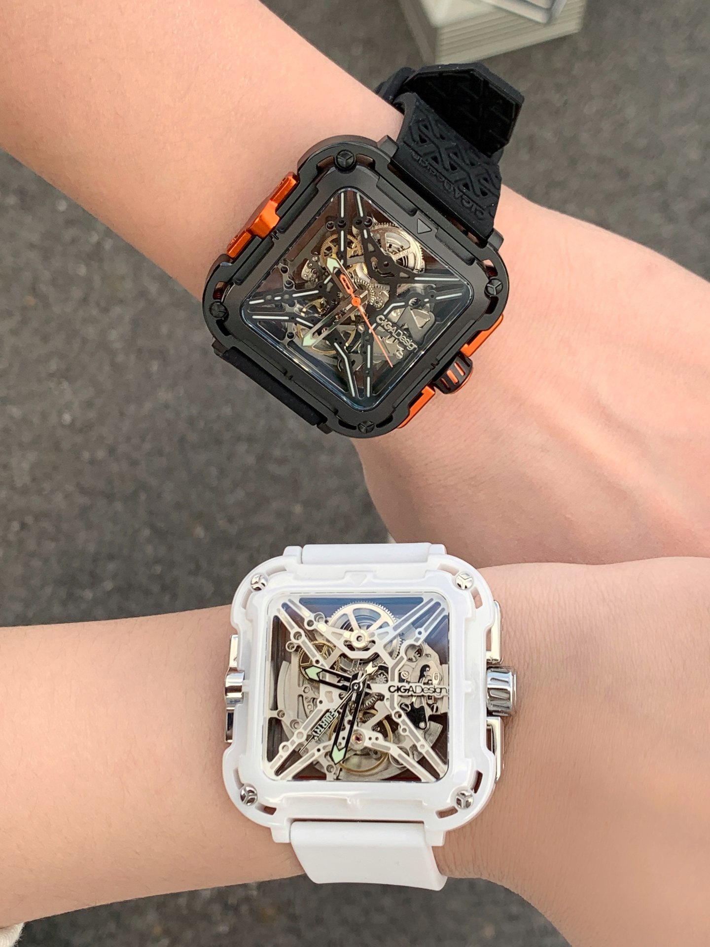 两只手表都是双面镂空的设计