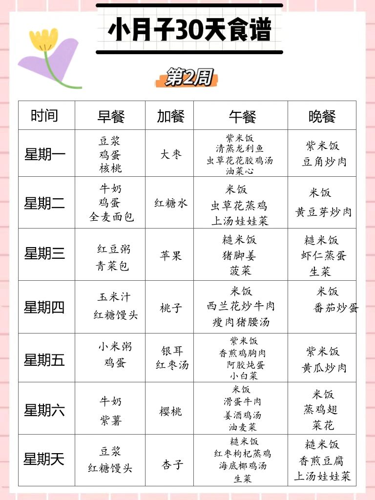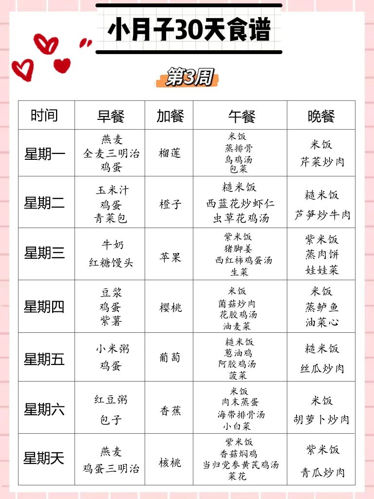 第三周可以在第二周的基础上增加一些比较补的汤或者菜品如果第三周的食谱都觉得补过头身体受不了的话,那第四周需要等身体完全恢复了才可以吃哦~