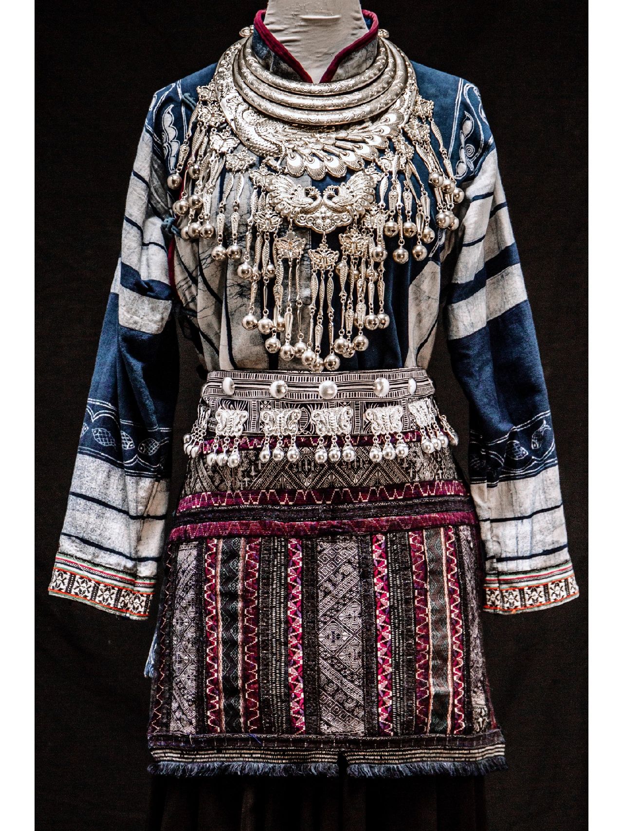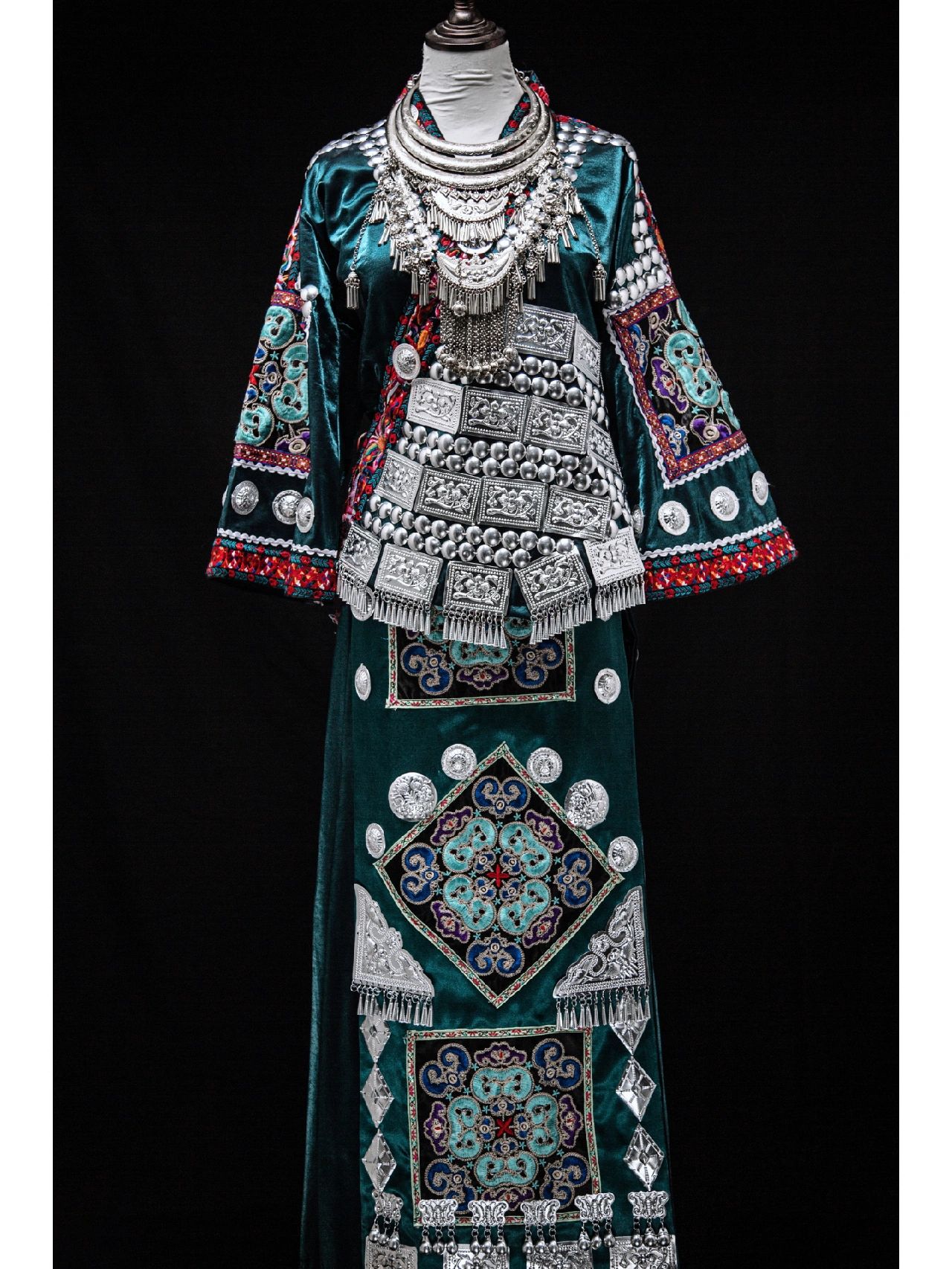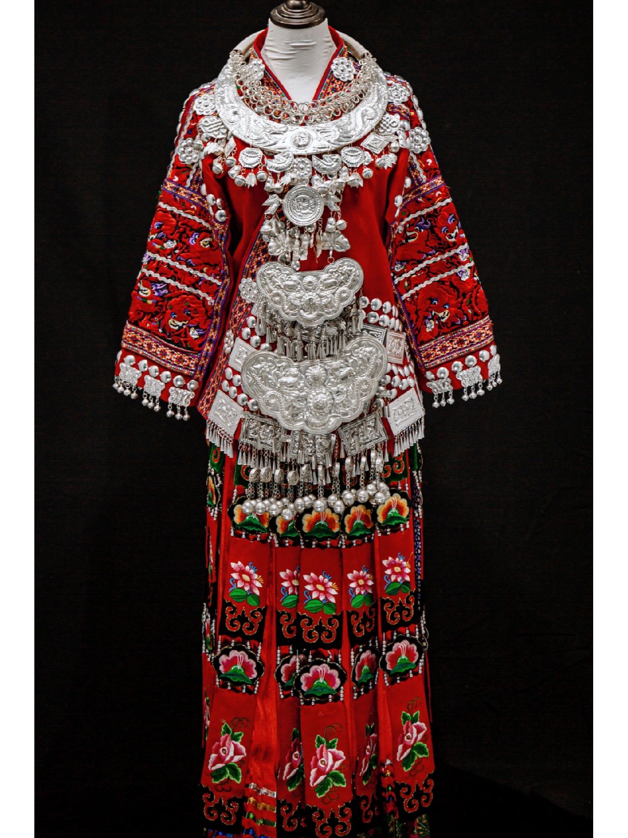苗族服饰,苗语叫“呕欠”,主要由童装、便装、盛装组成,“盛装”苗语叫“呕欠嘎给希”,即“升底衣服”,“ 呕欠涛”苗语称谓即“银衣”,下穿百褶裙,前后有围腰。湘西方言苗区和黔东方言苗区喜好银饰,黔南某些地区喜好贝饰,而西部方言区苗族服饰则少银饰。苗族服饰样式繁多,据不完全统计多达200多种样式,年代跨度大。银饰、苗绣、蜡染是苗族服饰的主要特色。这些多姿多彩的服饰铭载着本民族历经磨难的历史变迁,对美好生活的憧憬和古往今来生活环境的浓缩。史学家称之为:“穿在身上的史书。”