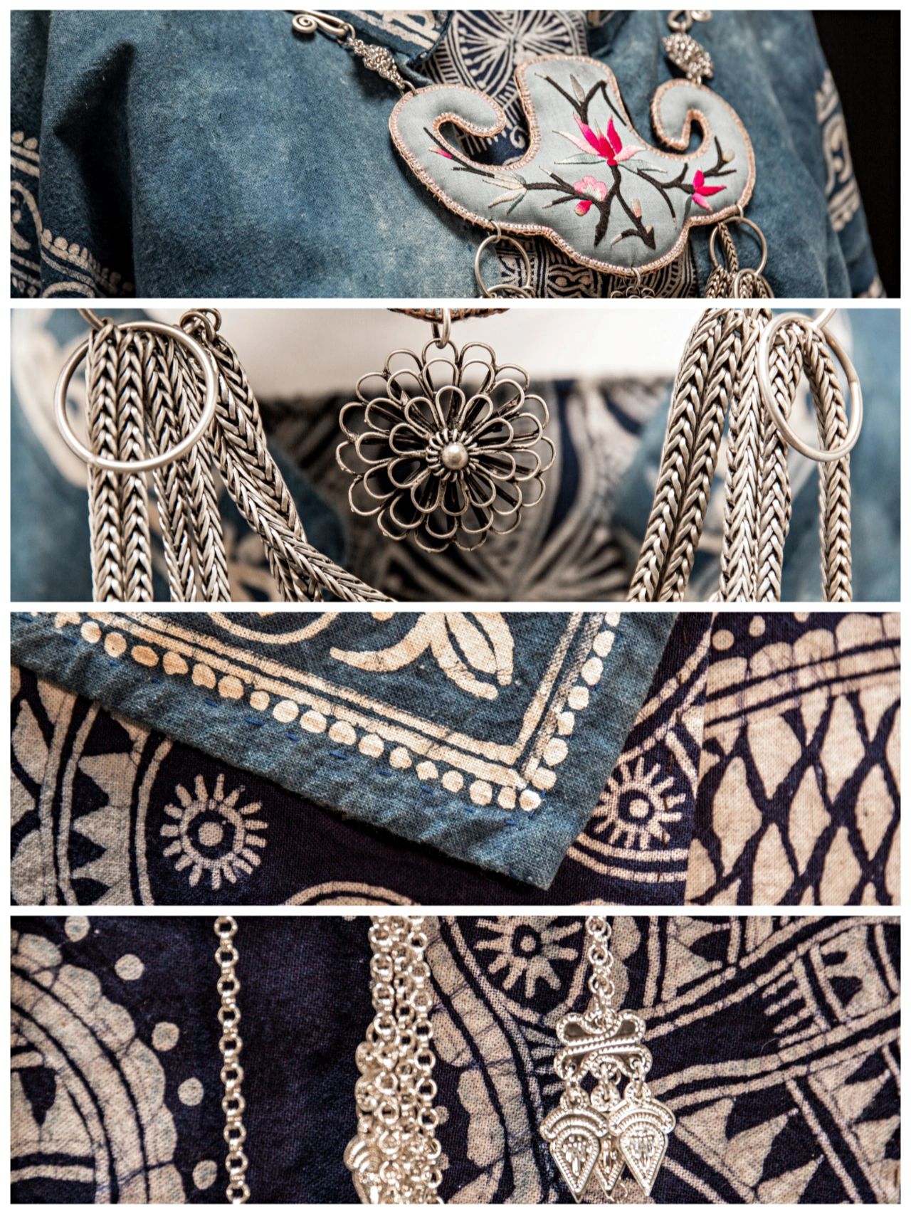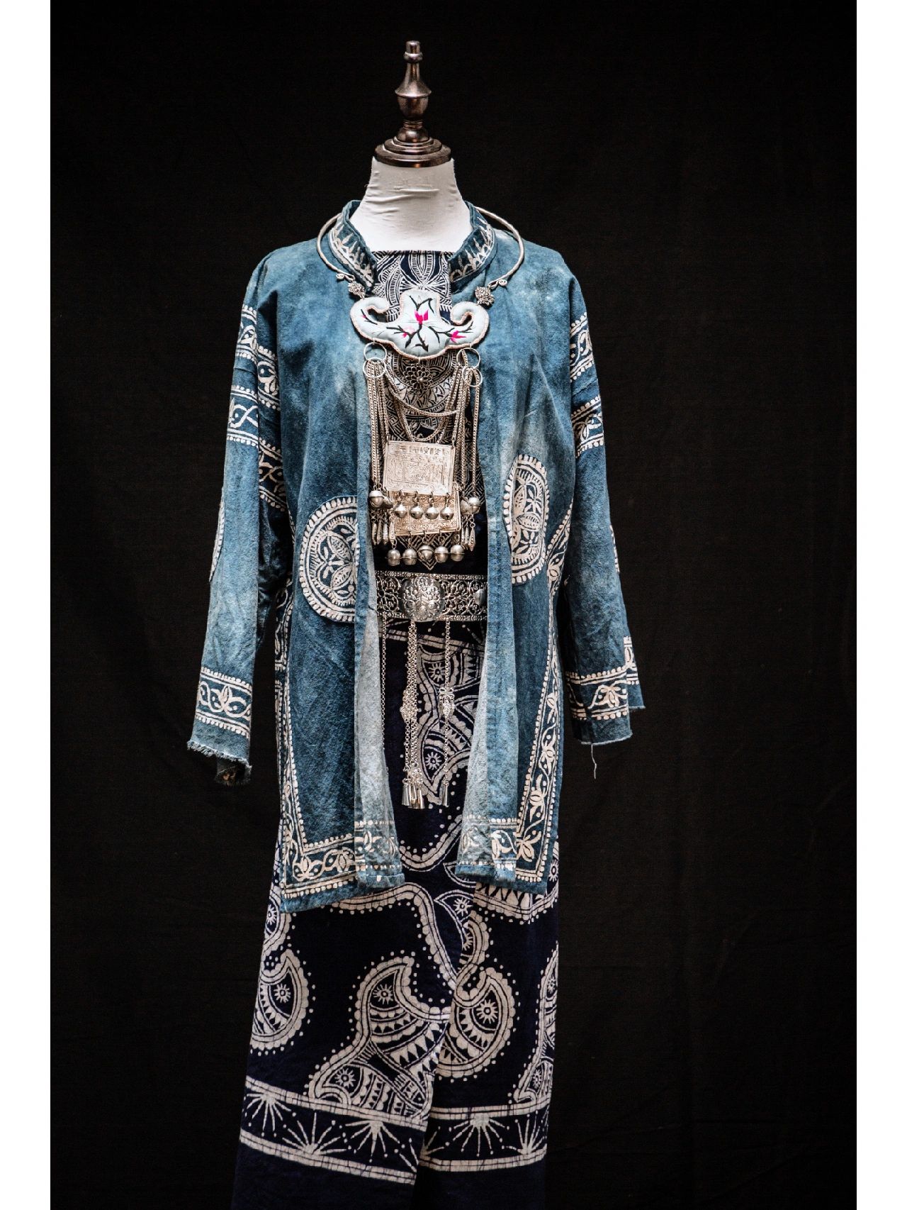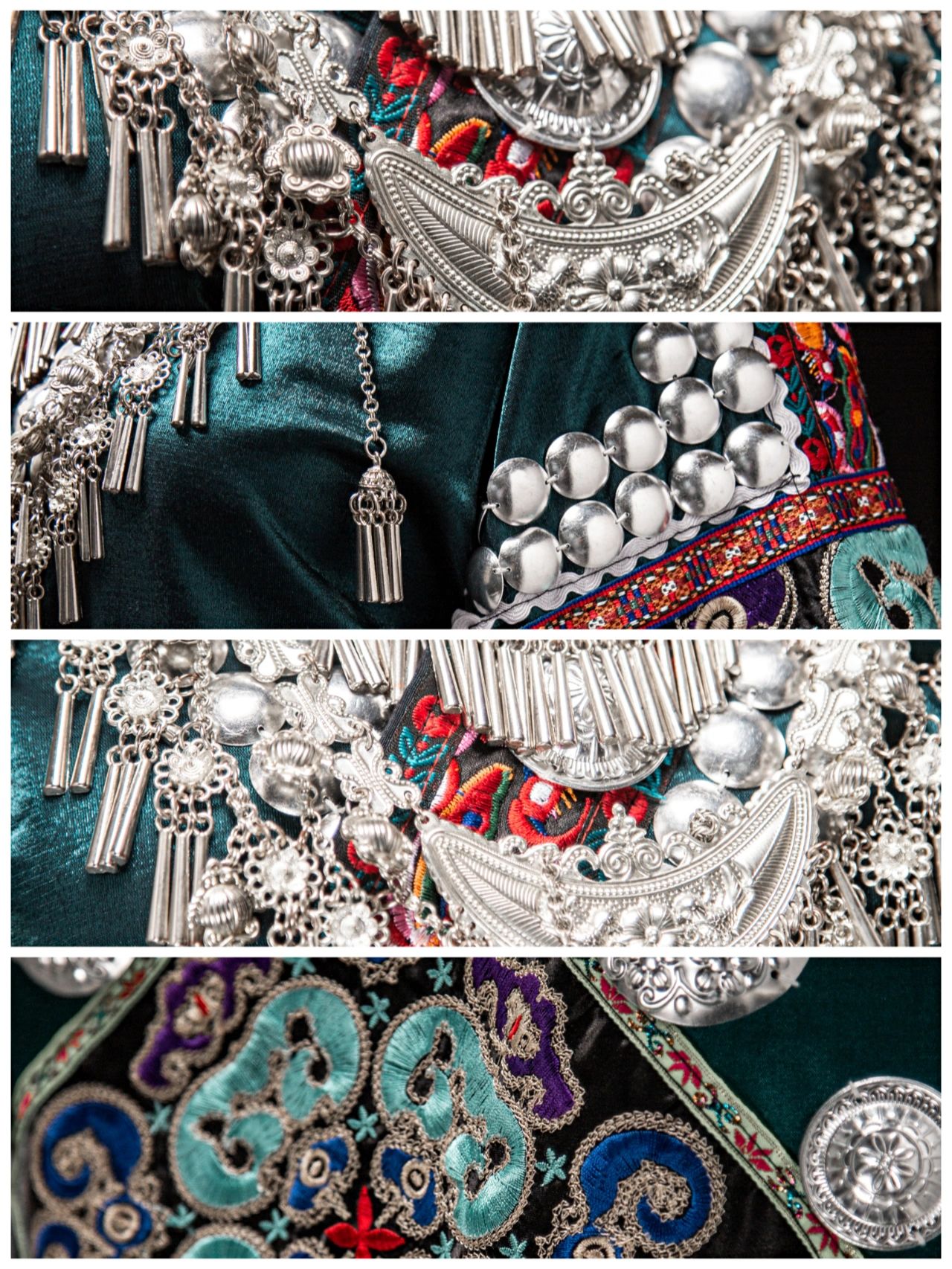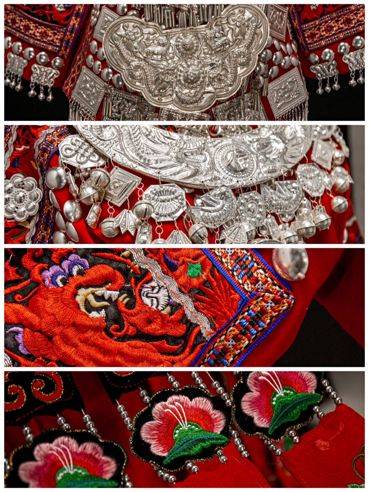苗族服饰,苗语叫“呕欠”,主要由童装、便装、盛装组成,“盛装”苗语叫“呕欠嘎给希”,即“升底衣服”,“ 呕欠涛”苗语称谓即“银衣”,下穿百褶裙,前后有围腰。湘西方言苗区和黔东方言苗区喜好银饰,黔南某些地区喜好贝饰,而西部方言区苗族服饰则少银饰。苗族服饰样式繁多,据不完全统计多达200多种样式,年代跨度大。银饰、苗绣、蜡染是苗族服饰的主要特色。这些多姿多彩的服饰铭载着本民族历经磨难的历史变迁,对美好生活的憧憬和古往今来生活环境的浓缩。史学家称之为:“穿在身上的史书。”