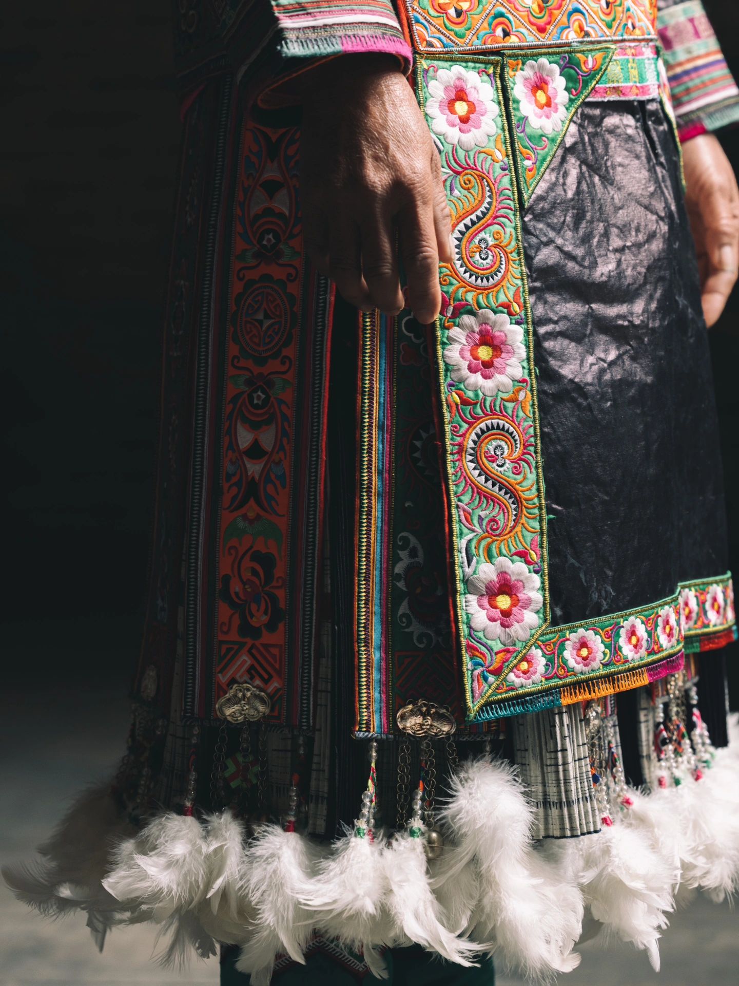图1、 2:榕江乔亥/分从-刺绣+蜡染(百鸟衣,它由羽毛裙和花衣组成,服饰色彩艳丽,图案古朴奇特,反映了苗族人民灵巧精细的刺绣工艺和独特审美情趣,羽毛裙和花衣都以家织土布为底,绣有平花,且精巧装饰而成。其胸兜、围腰等部件多绣各种花鸟、虫、鱼、蝴蝶等动物图案;而衣或裙脚吊满白羽毛 )