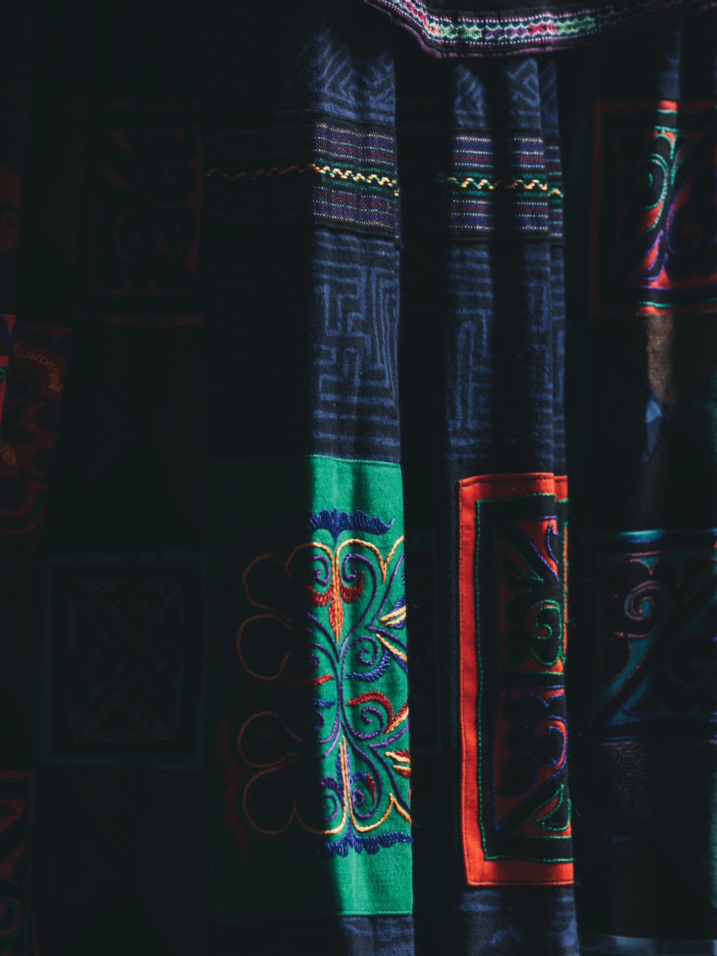 图3: 黔西化屋基-刺绣+蜡染(有象征人与自然和谐相处的水纹图纹,以及龙、凤、蝴蝶、花、鸟、虫、鱼等。用手工纺织土布、棉布、丝绸缎等面料,以红白绿色为主,最常绣的针法是贴布马尾绣、贴布平绣和十字绣。)