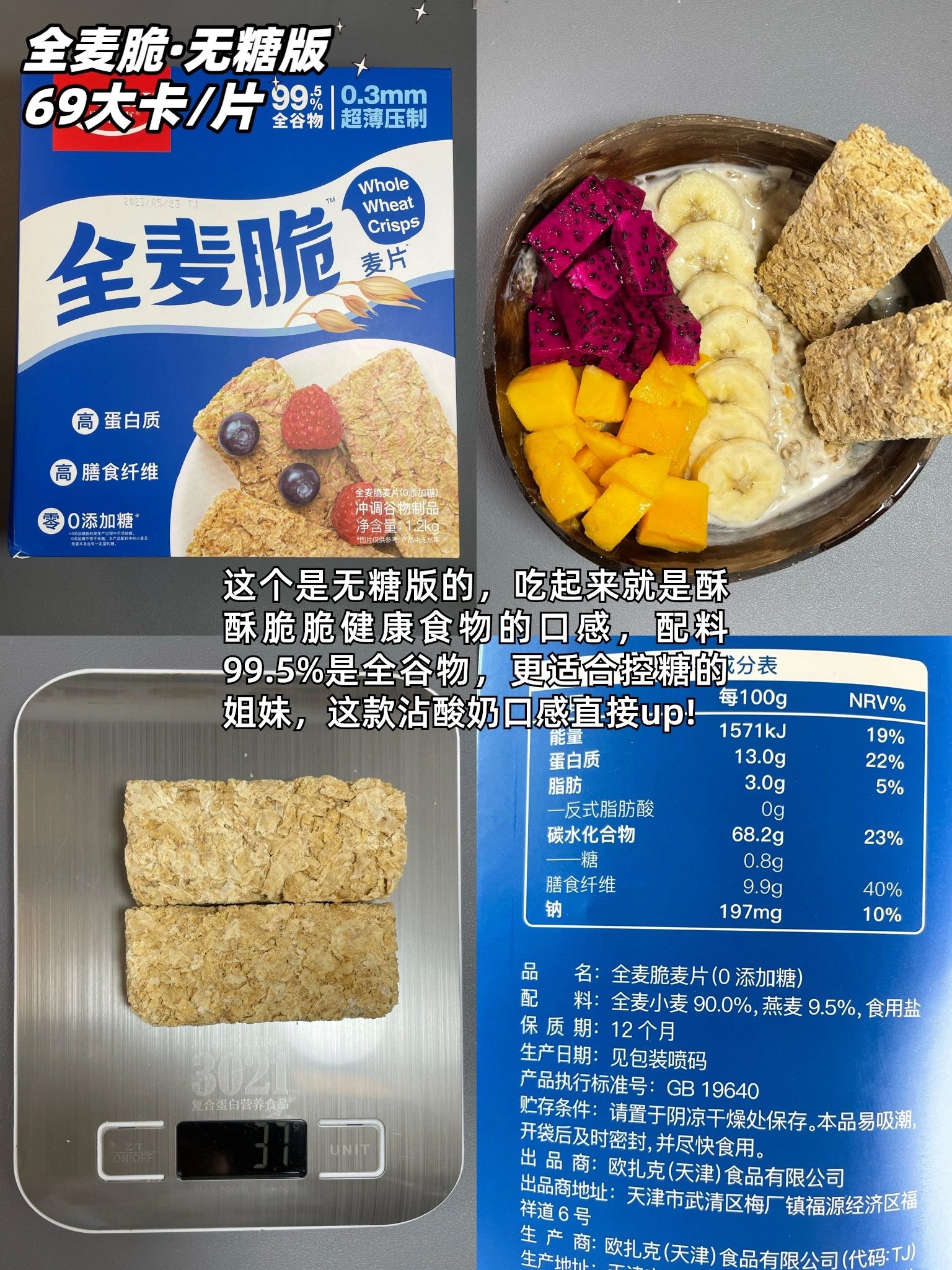这个是无糖版的,吃起来就是酥酥脆脆健康食物的口感,配料99.5%是全谷物,更适合控糖的姐妹,这款沾酸奶口感直接up!