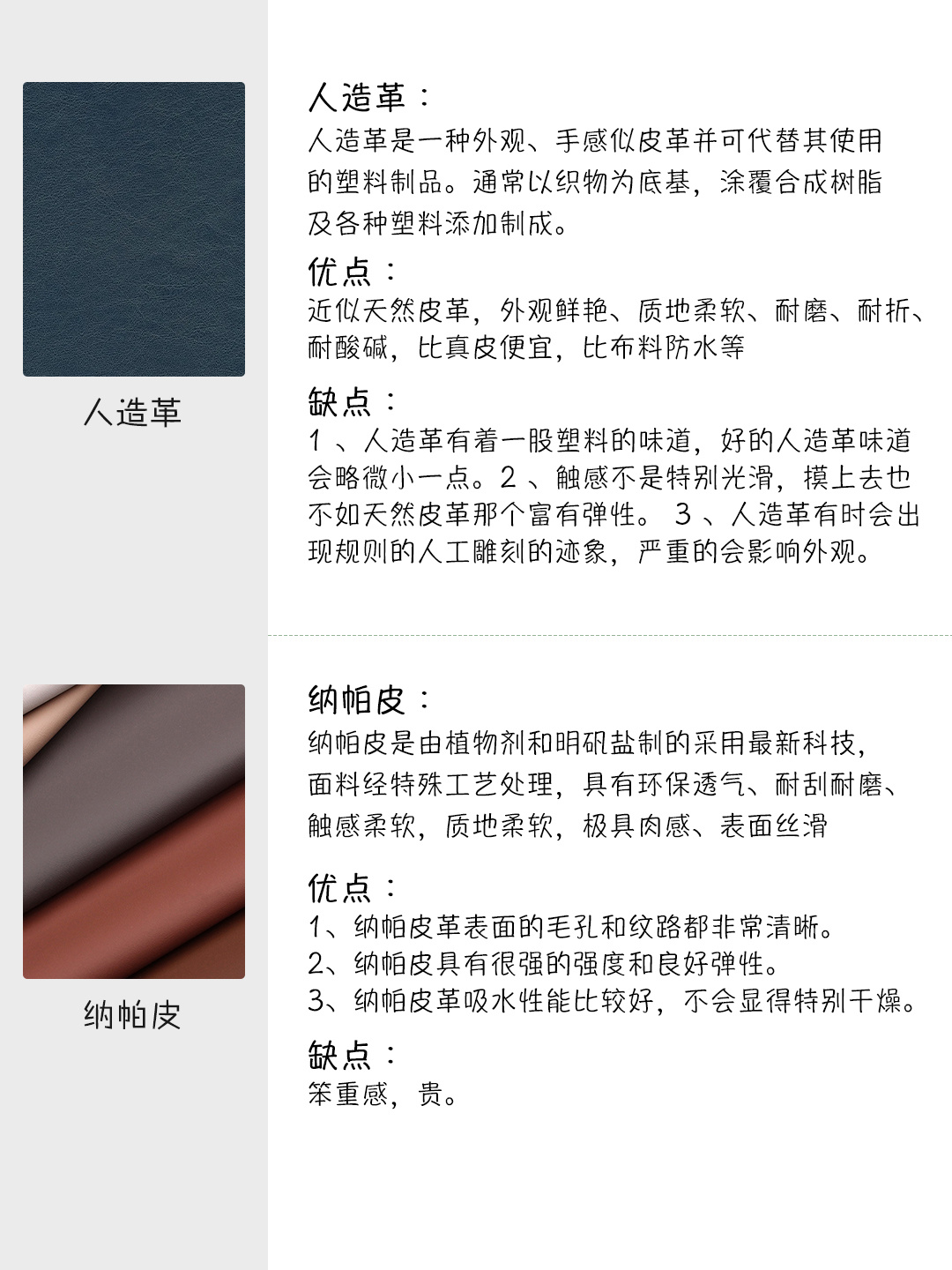 优点:近似天然皮革,外观鲜艳、质地柔软、耐磨、耐折、耐酸碱,比真皮便宜,比布料防水等