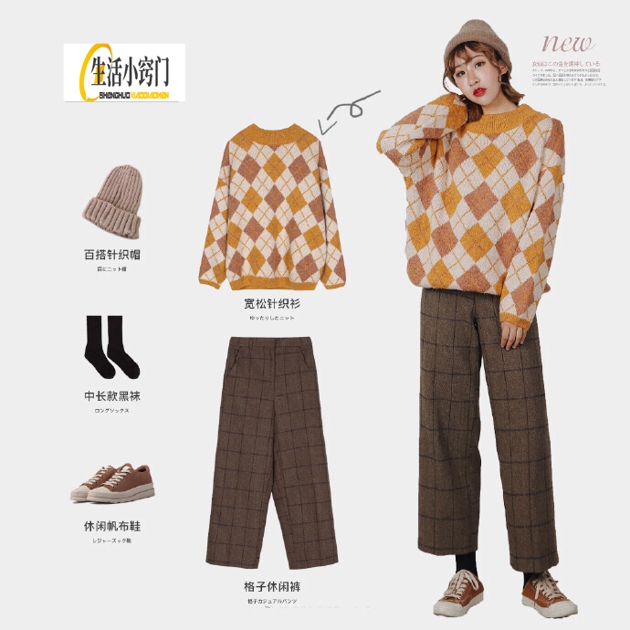 look2:菱格毛衣配格纹裤,你们一开始是不是想到格纹配格纹,很奇怪吧!!其实只要颜色不一样,大小不一样的格纹,就不会奇怪~但一定要保证裤子的格纹是细格,这样整体才不会乱。