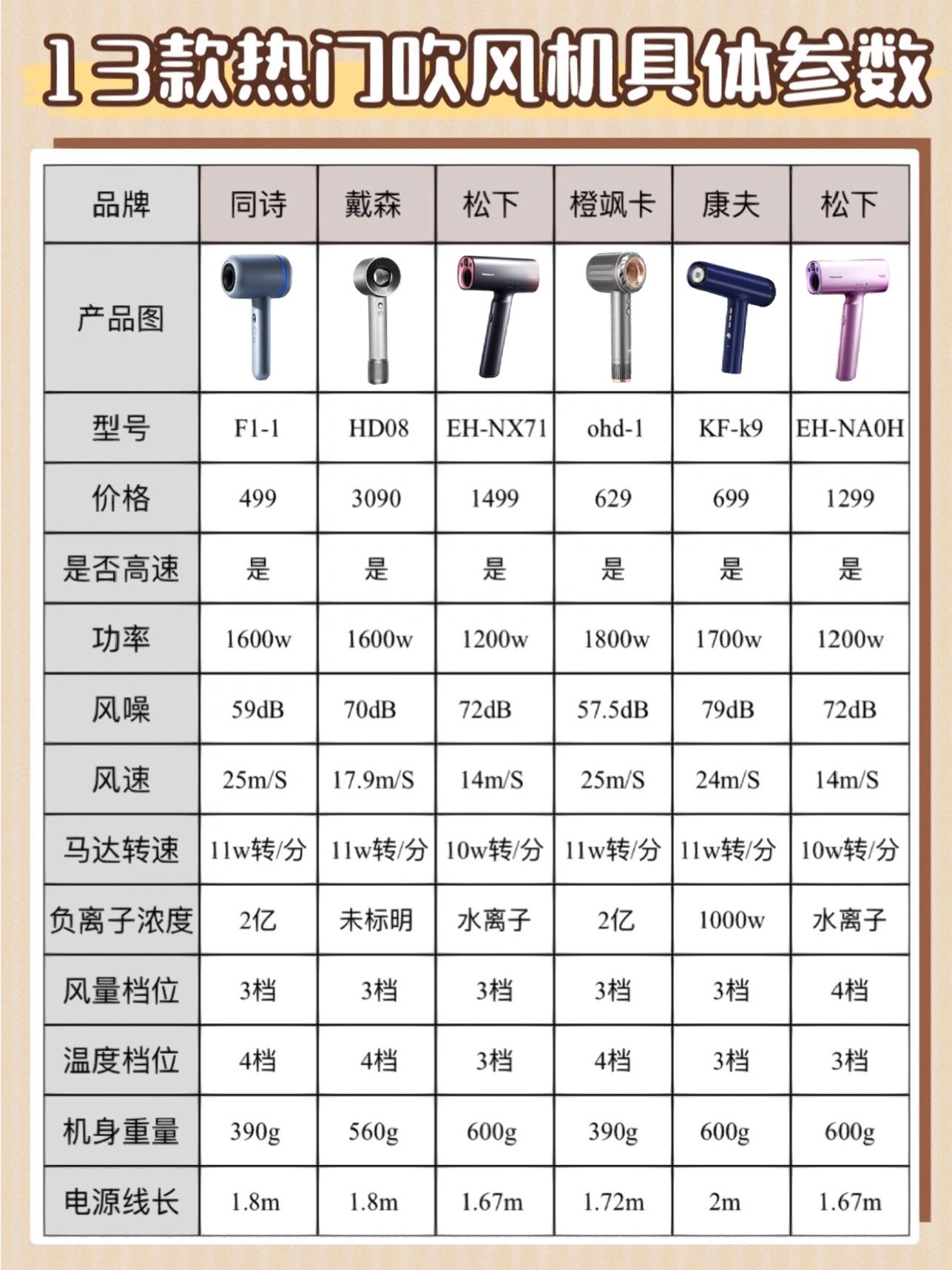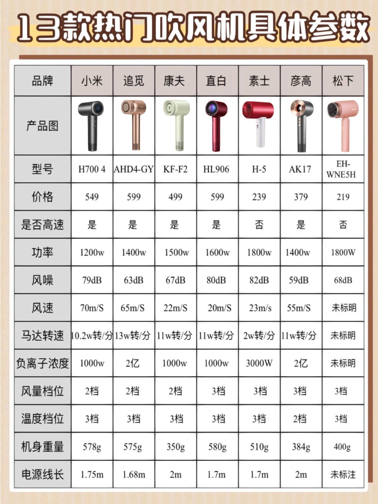 图3-图8是我集合了当下13款热门高速吹风机的功率、负离子浓度、风速、风量/风温档位、机身重量、线长度的具体参数,大家可以参考一下!