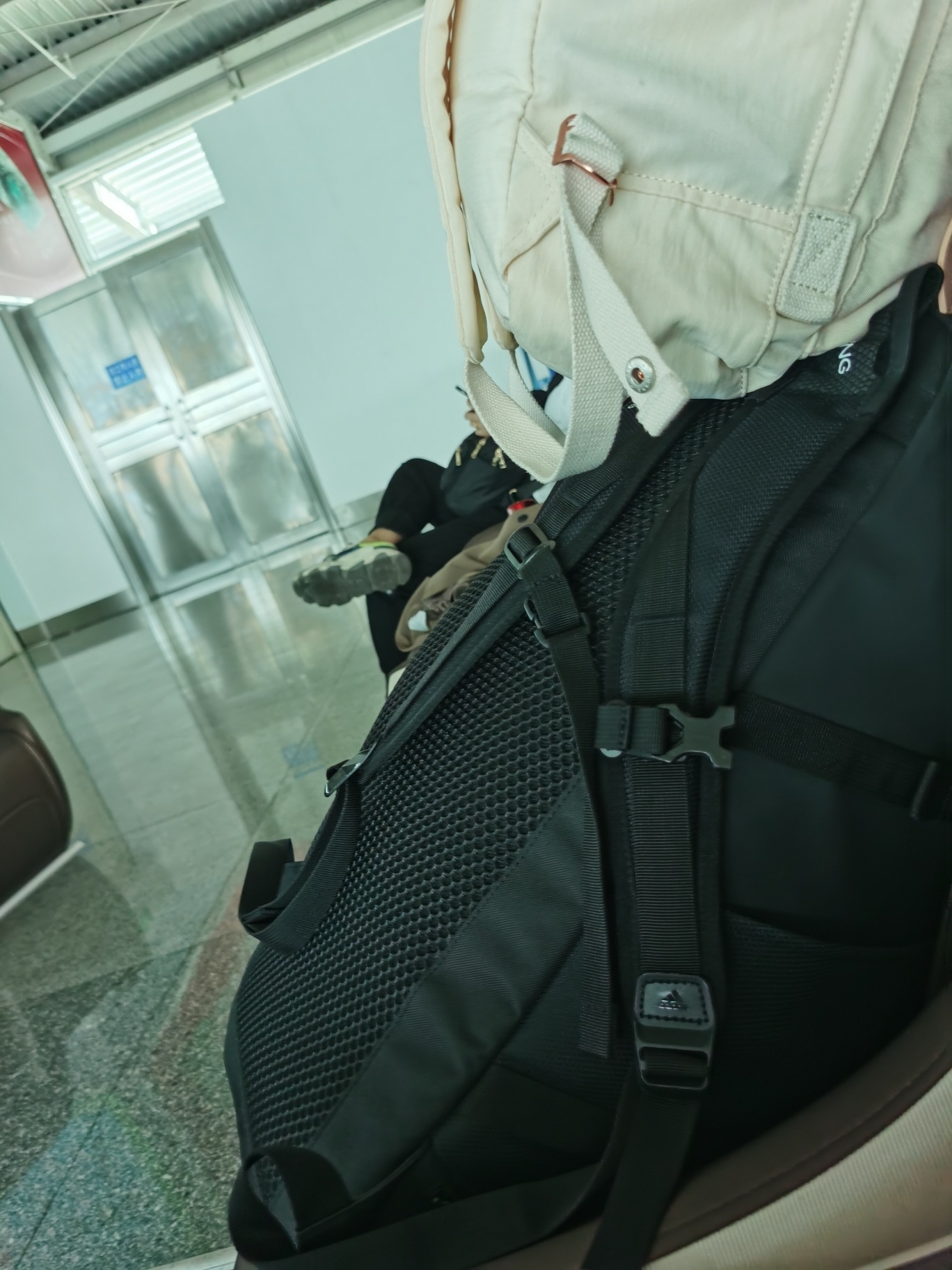2.背包问题,真的,春秋航空只查你带不带箱子,你背个比箱子大的书包他绝对让你上,不信你看看我图片,这个包是阿迪的,巨大登山包,比我20寸行李箱大!但是!出门背这么大个包真心累!而且可以在背一个小包她们不会说的!
