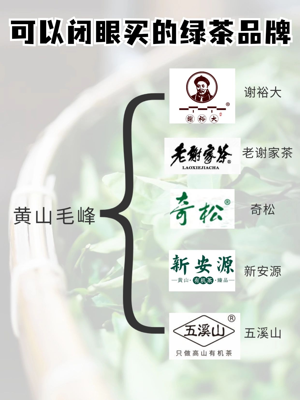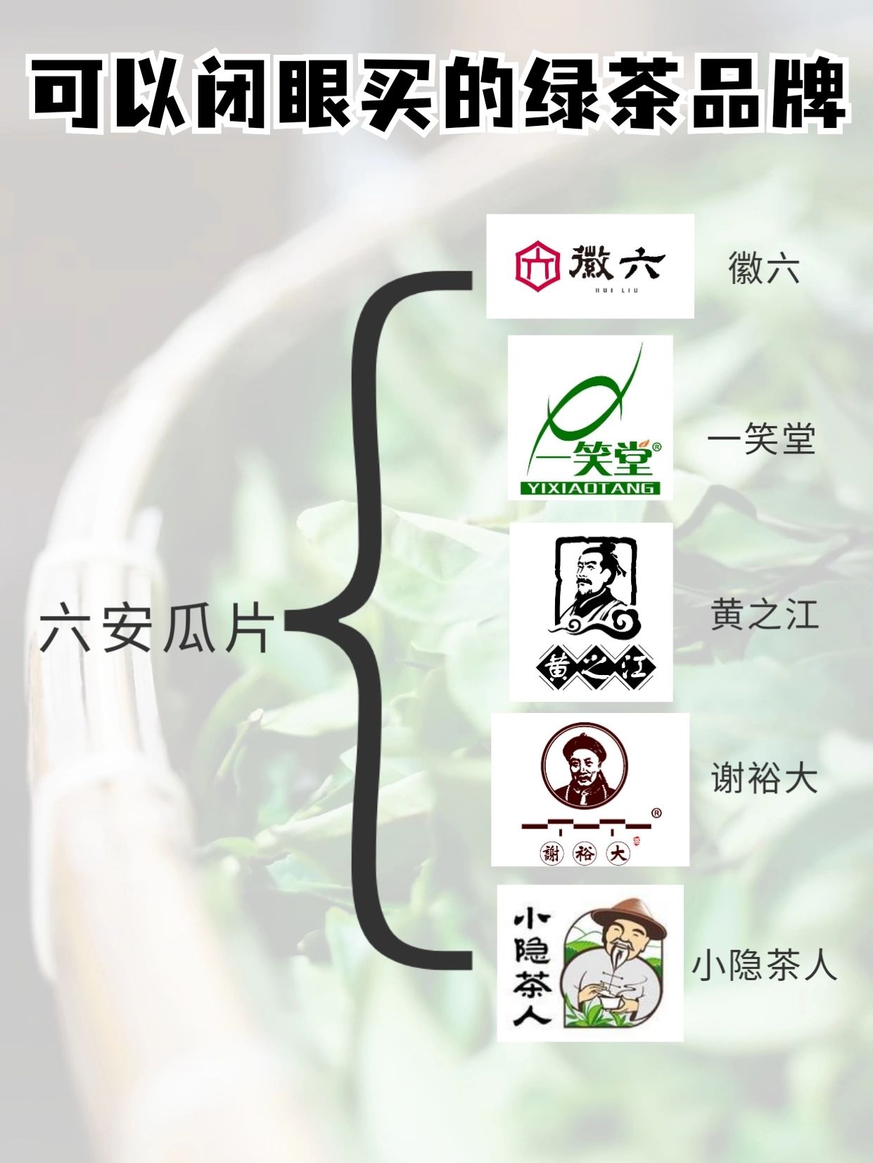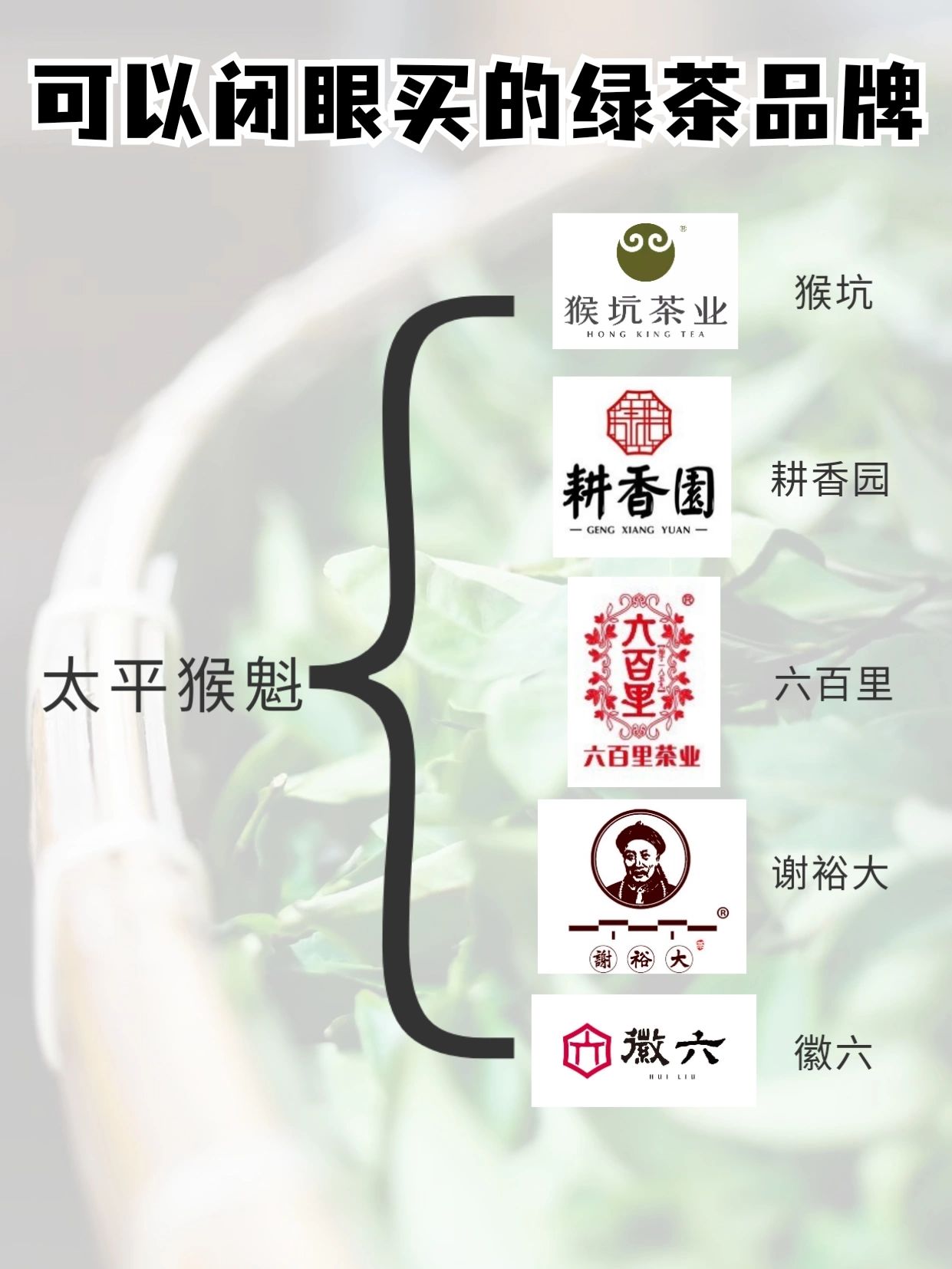 六安瓜片、黄山毛峰、太平猴魁等安徽绿茶,推荐谢裕大、猴坑、徽六。