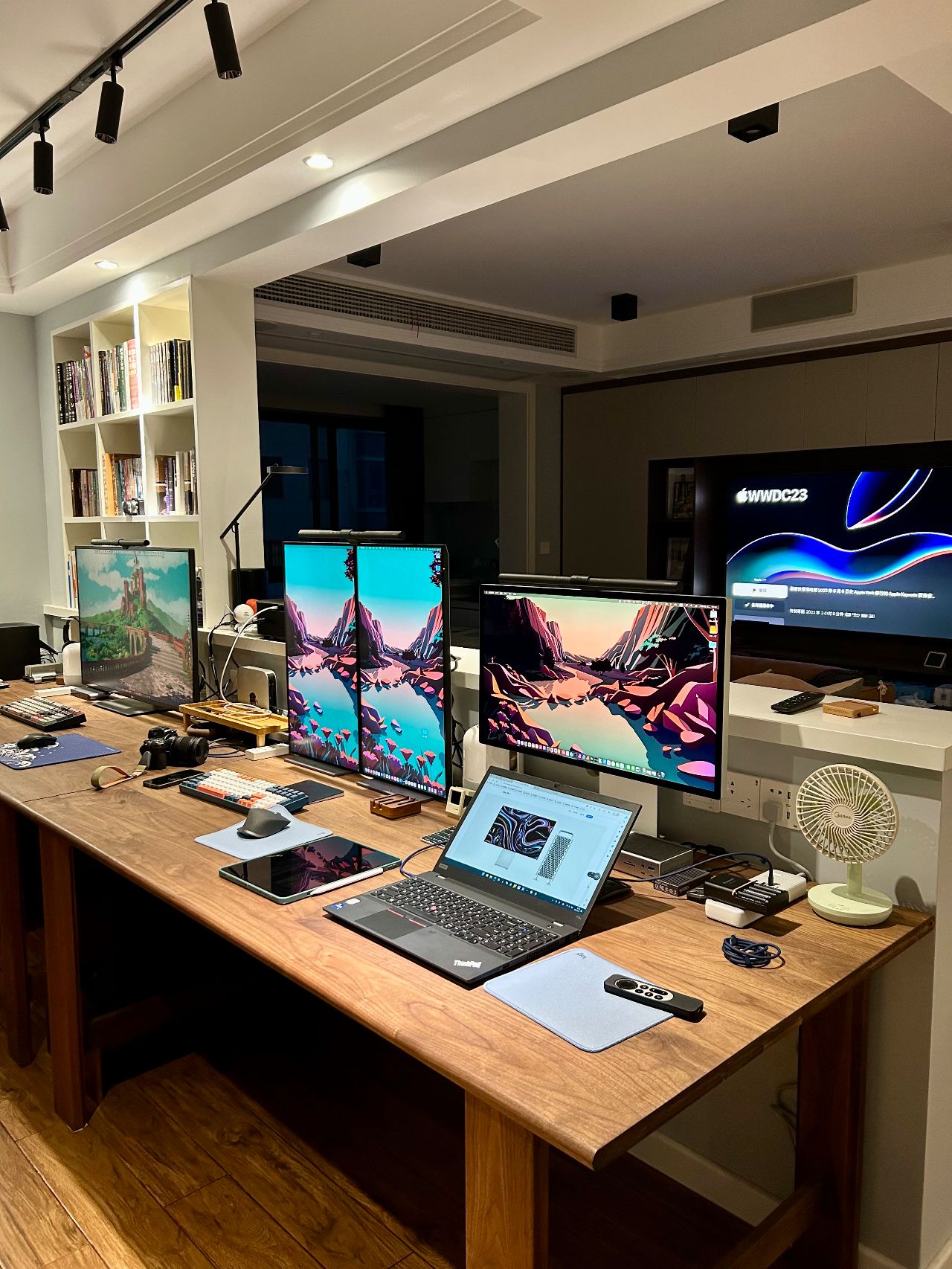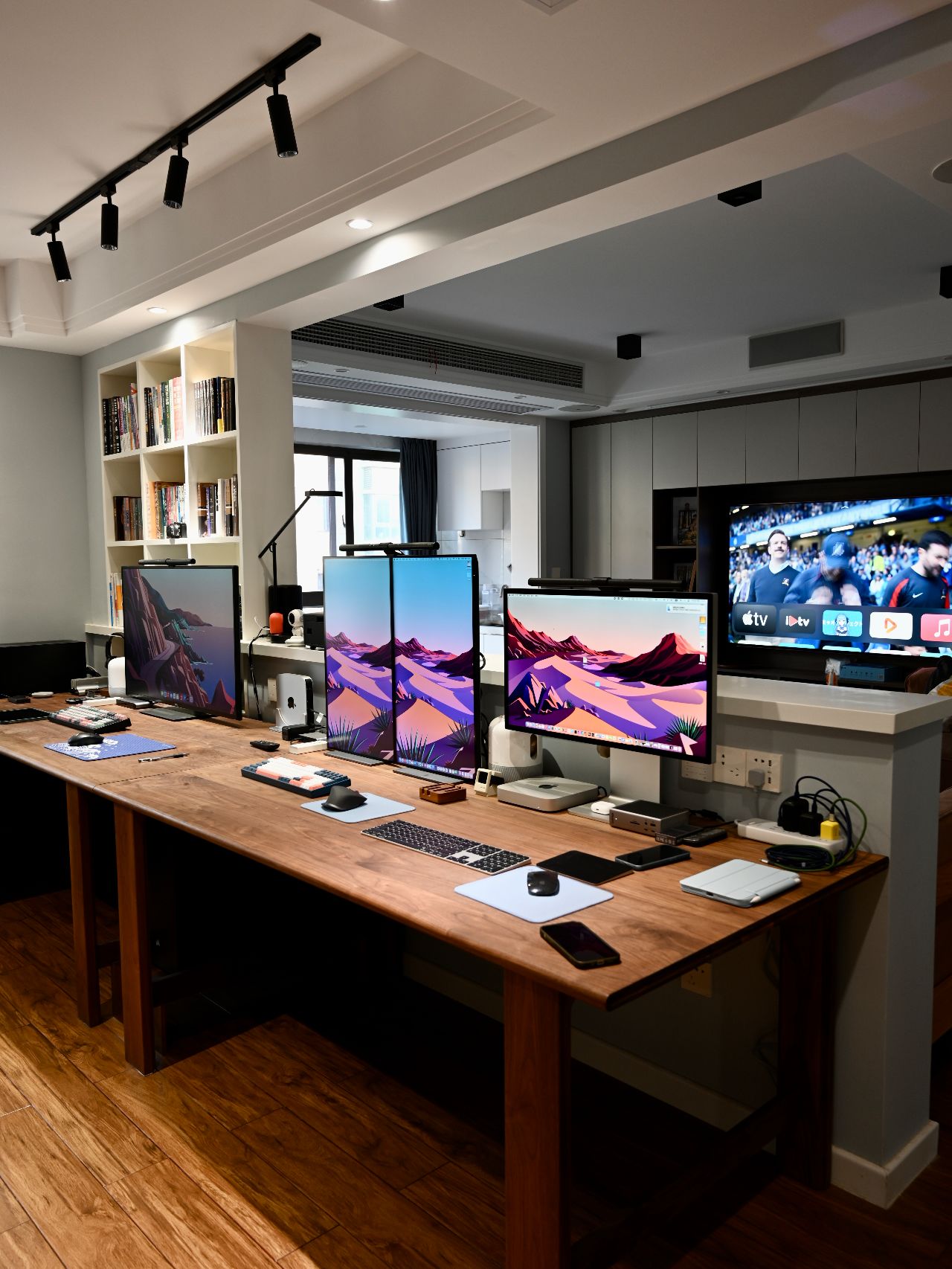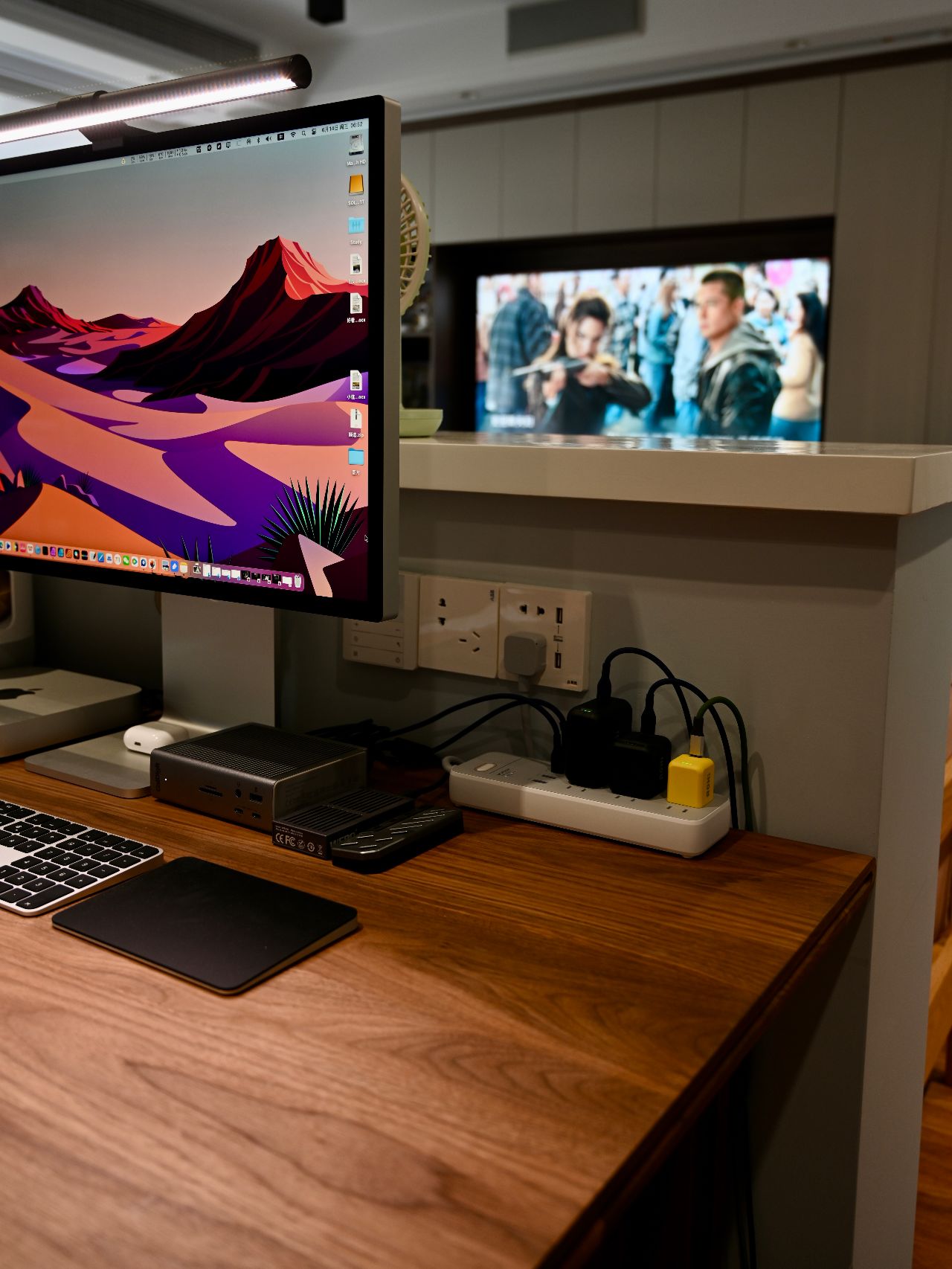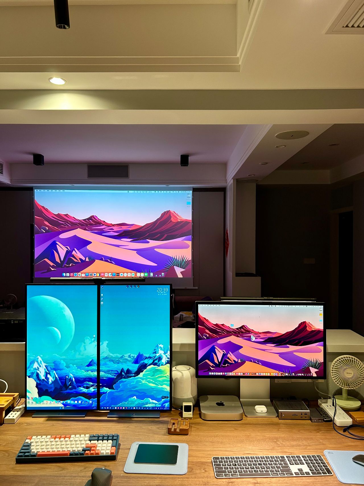 有两张同款型电脑桌拼成,外侧一张长度1.8m,内侧一张长度为2m,宽度都是0.9m。厚度为2.6cm。宽度大的好处就是可以放下更大尺寸的显示器,同时收纳的东西也更多。当然大桌面的好处,就是用起来贼舒服。如今你们看到的已经放下三台电脑,办公娱乐都能很好的满足。除了两台Mac mini因为小巧放在桌面上外,其他两台较大的ATX机箱PC主机均被巧妙的安放,不占用桌面半点空间。