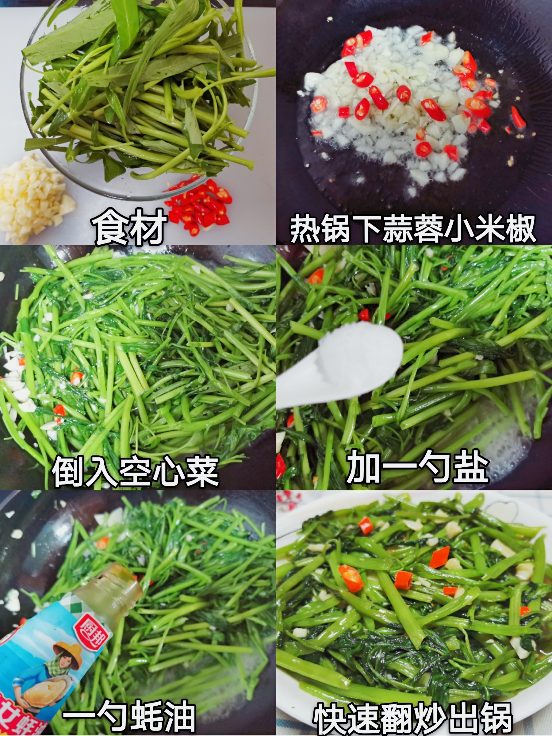 空心菜400克,蒜,小米椒三个,盐,蚝油