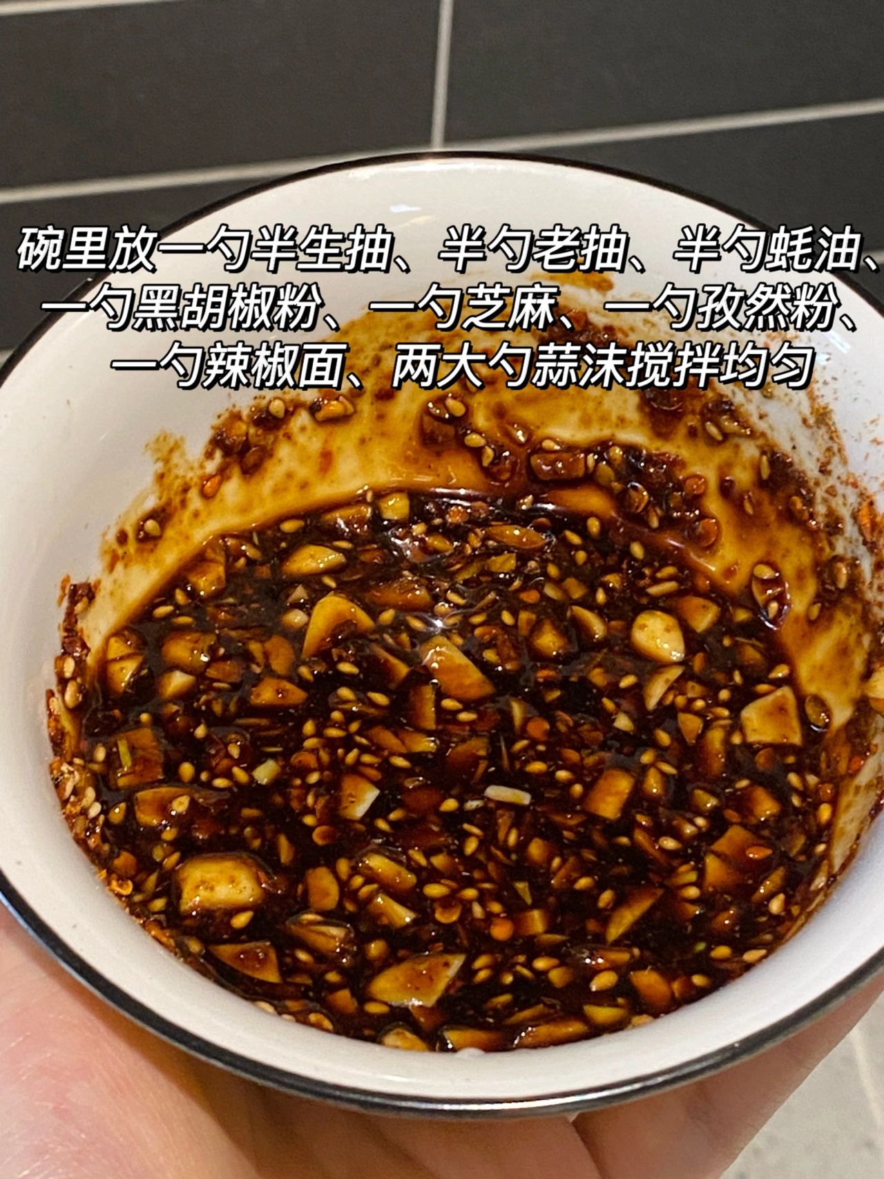 1碗里放一勺半生抽、半勺老抽、半勺蚝油、一勺黑胡椒粉、一勺芝麻、一勺孜然粉、一勺辣椒面、两大勺蒜沫搅拌均匀。