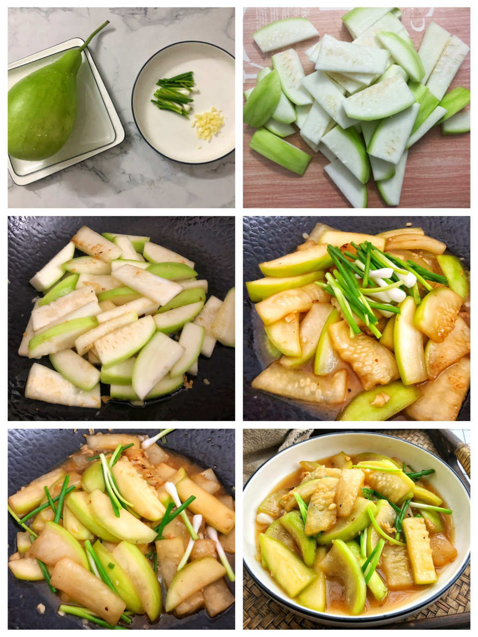 第5步:加入葱段炒2分钟,待蒲瓜煮至汤汁浓稠即可。