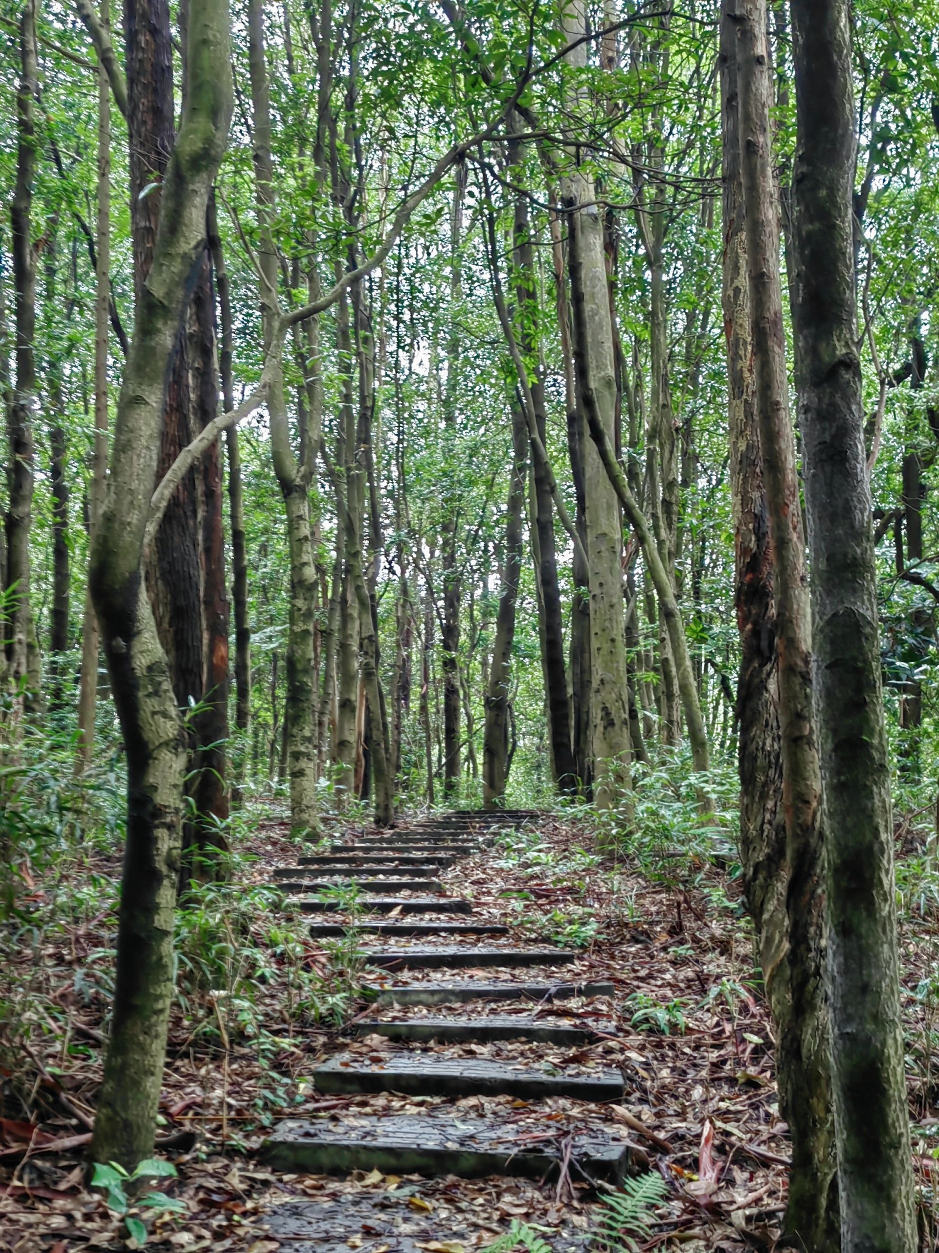 进入公园走过按树大道后,往左走上石阶梯看见“犀牛角登山道”大石头,往左是较平缓登山道,流线型蜿蜒至热带森林中,非常适合拍大片