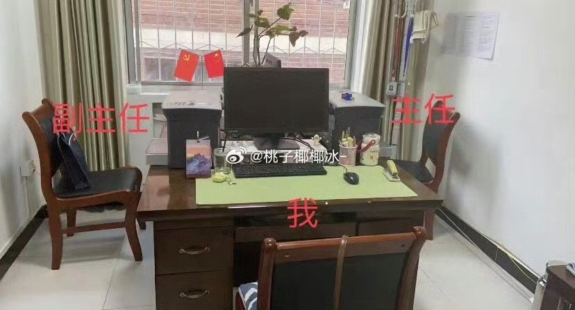 哪有你这种摆法,一张桌子靠窗,两张桌子打横并列,主任背对窗户,你和副主任面对面,主任进出通道走你背面,有啥事情都向你请假,哈哈哈