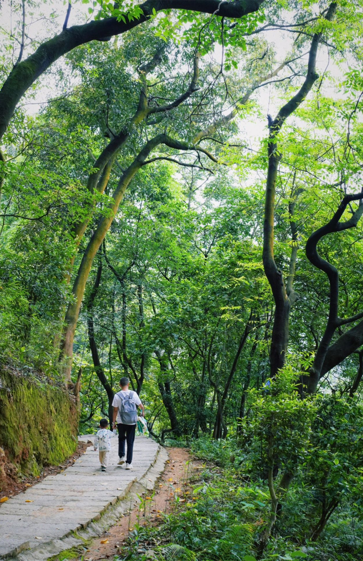 我们选择了向右👉走石板路上山,沿途穿过竹林、树林,还有小溪,避免暴晒,走起来相对轻松