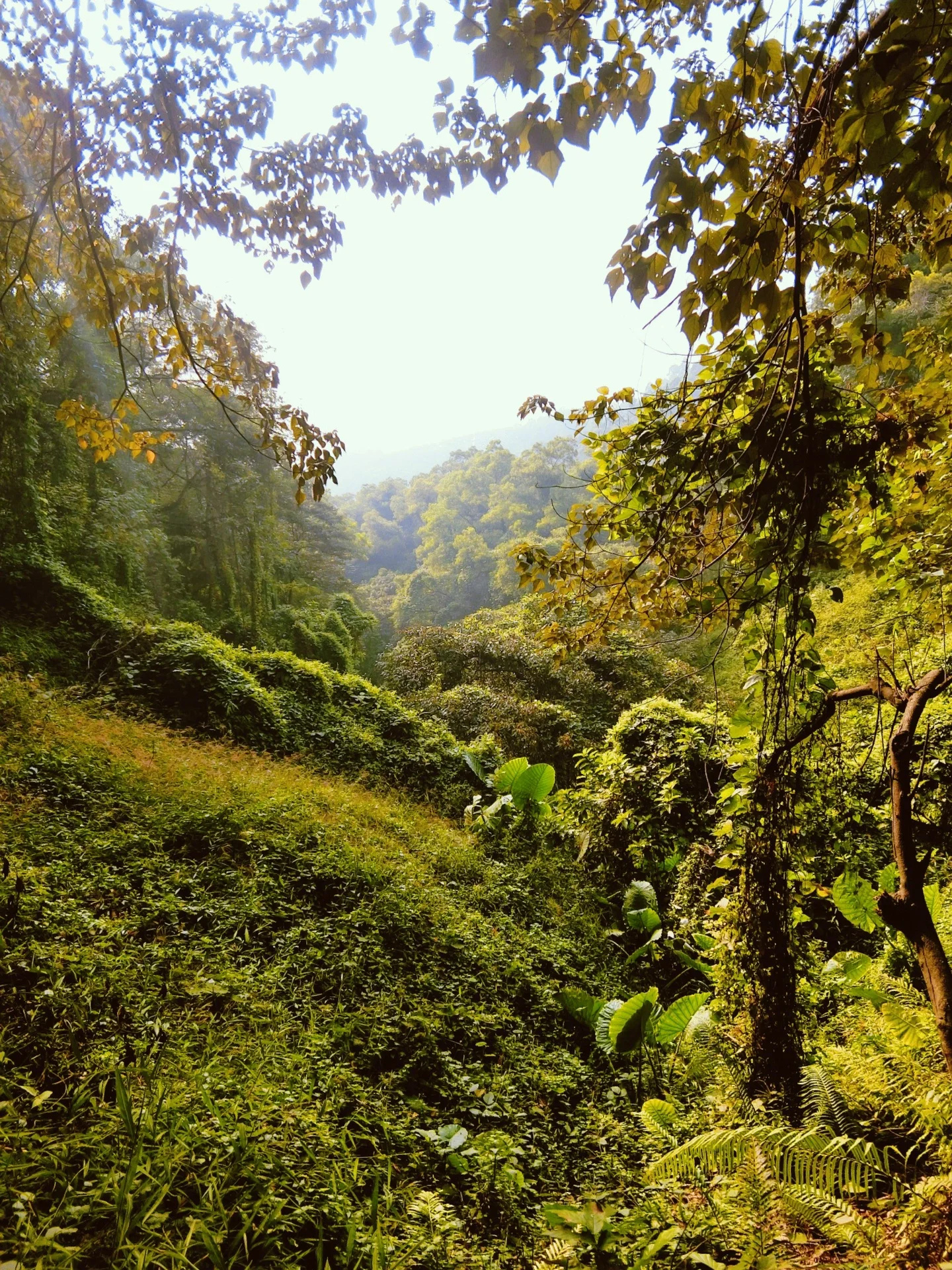 从牛岭山出发.秋季山里烟雨蒙蒙的。