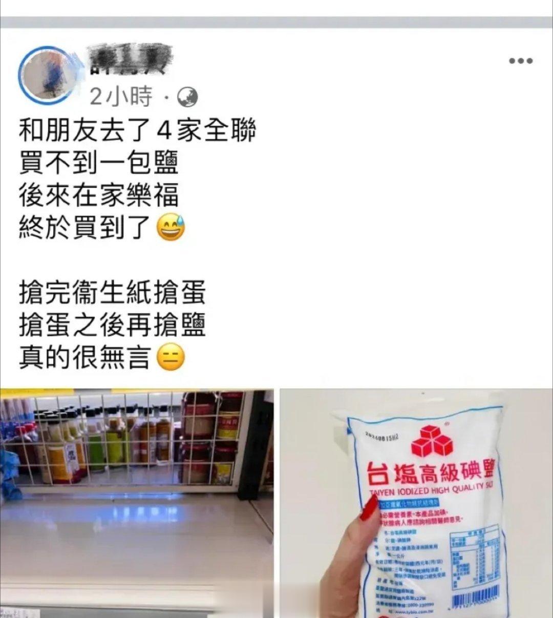 湾湾抢完卫生纸再抢蛋!抢蛋之后再抢盐!真是很无言!台湾社会现状写照![呲牙笑][呲牙笑]