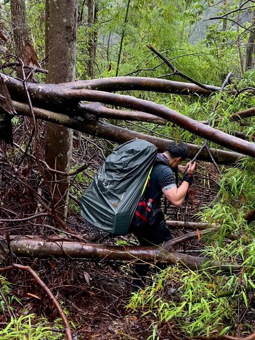 •海拔800m左右路况开始复杂 受冰灾影响压倒的大树挡住前进的道路 对重装徒步者来说有一定难度。