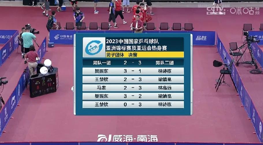 2023国乒亚洲锦标赛及亚运会热身赛男团决赛: 樊振东空砍两分,王楚钦第二盘2:0领先梁靖崑,被梁靖崑3:2翻盘,第五盘3:0被林诗栋横扫,热身赛抓紧查漏补缺,后面的比赛继续加油! 🏓【男队一团2-3男队二团】T2 第一盘:樊振东3-1林诗栋 【11-9,7-11,11-3,11-7】 第二盘:王楚钦2-3梁靖崑 【11-9,11-4,8-11,6-11,3-11】 第三盘:马龙2-3林高远 【13-11,7-11,11-3,7-11,8-11】 第四盘:樊振东3-2梁靖崑 【11-4,17-15,7-11,3-11,11-7】 第五盘:王楚钦0-3林诗栋 【4-11,5-11,8-11】