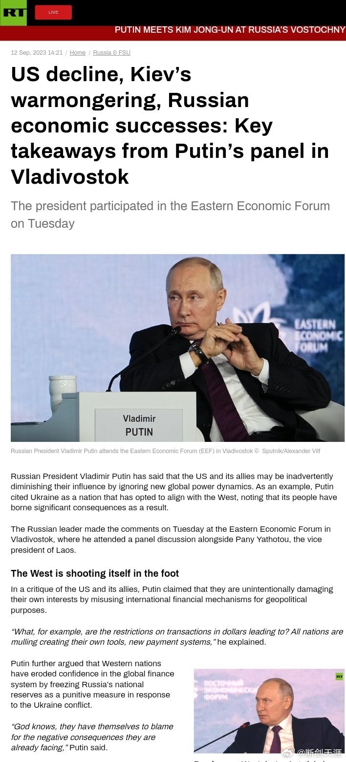 在对美国及其盟友的批评中,普京声称,他们滥用国际金融机制来达到地缘政治目的,无意中损害了自己的利益。