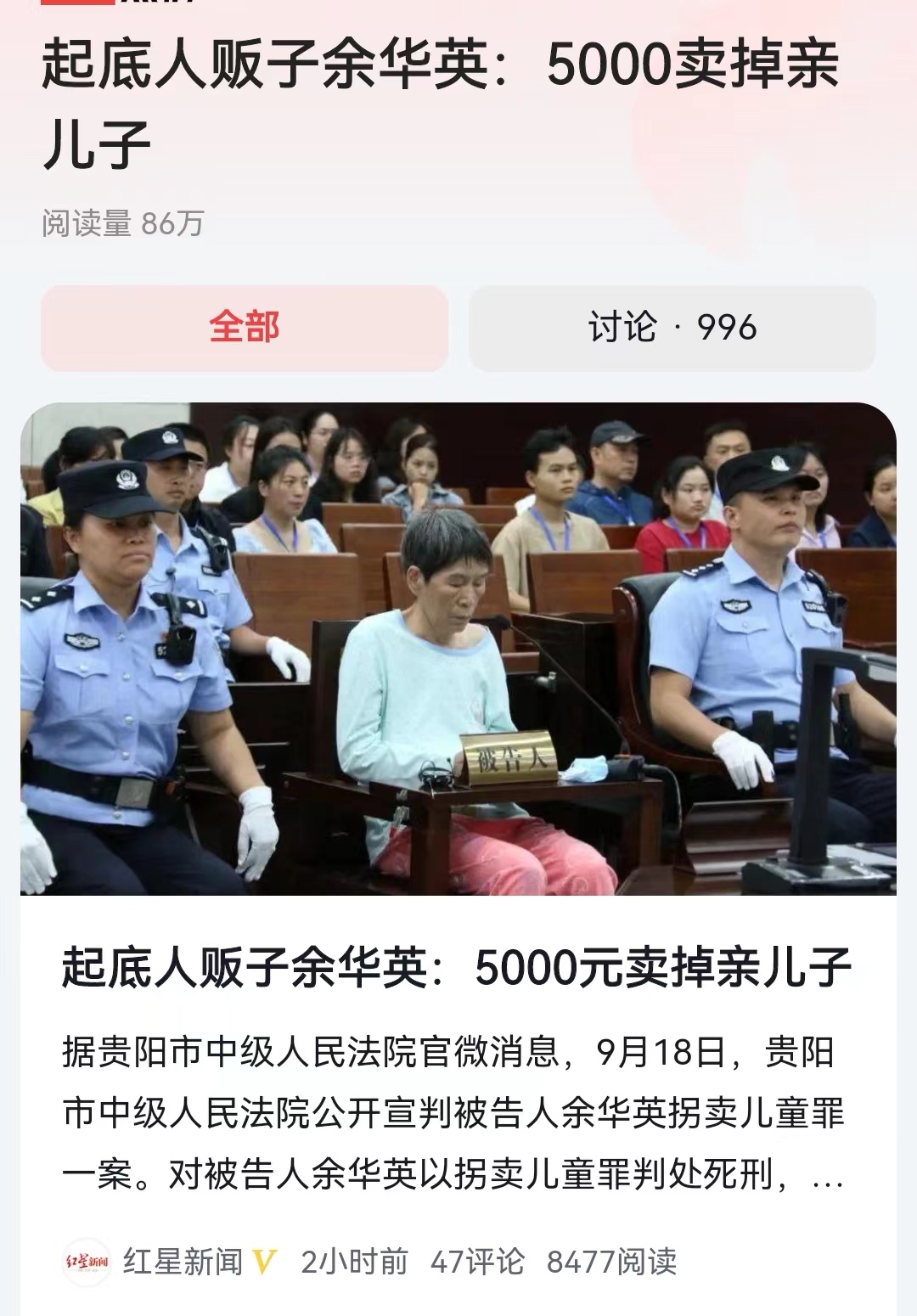 这就是一个北方版的“广东梅姨”。人贩子生涯先从5000元卖掉自己的亲生儿子开始,最后陆续一共卖掉11个孩子,该不该判死刑呢?最终一审被判死刑,但是人贩子余华英还诉说当天就要上诉。