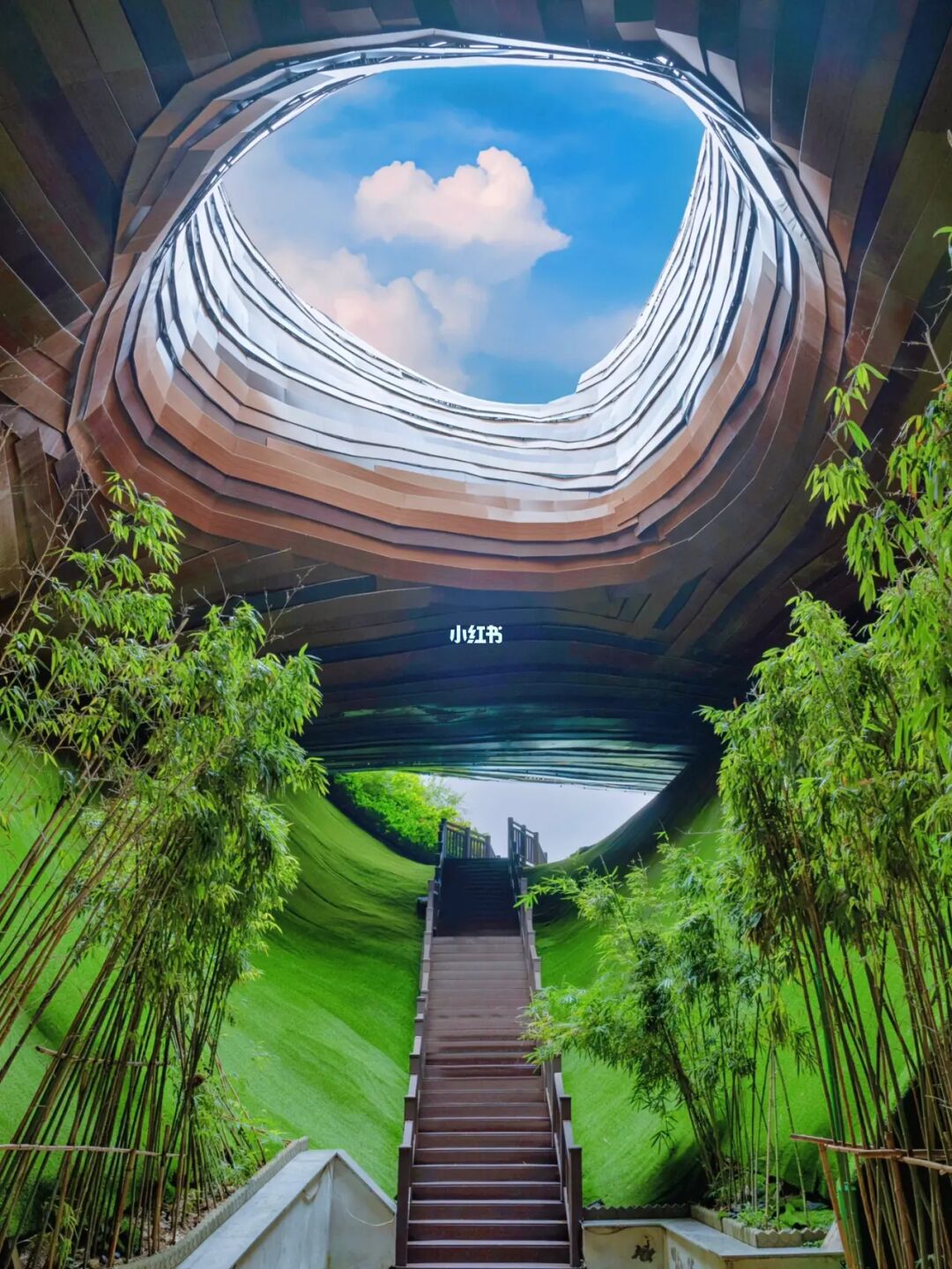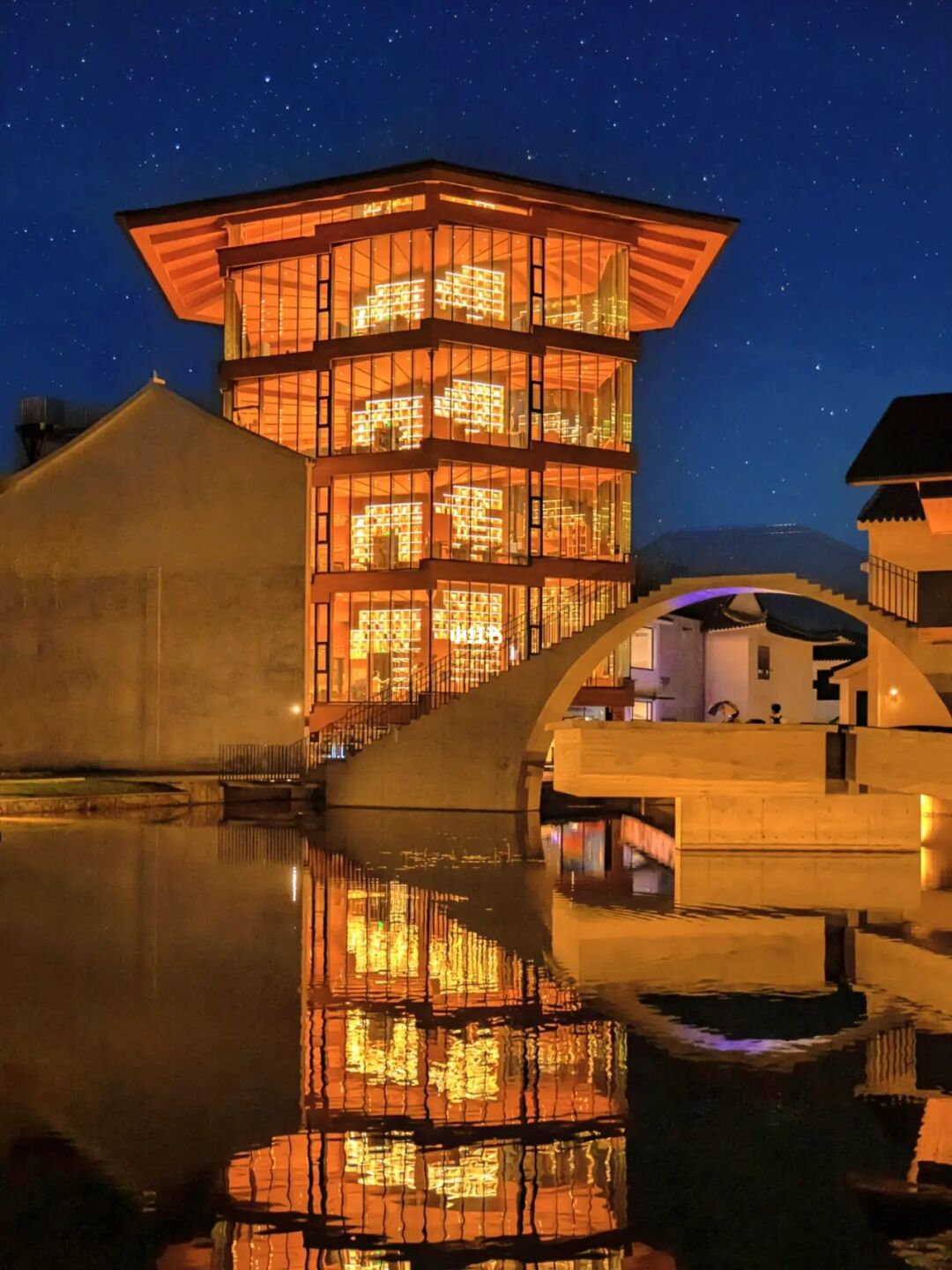 建议蓝调时刻来逛,六边形书塔亮灯后,倒影在湖面上超美~书塔内楼梯是旋转上升,走到塔顶🉑️俯瞰文化村全貌!