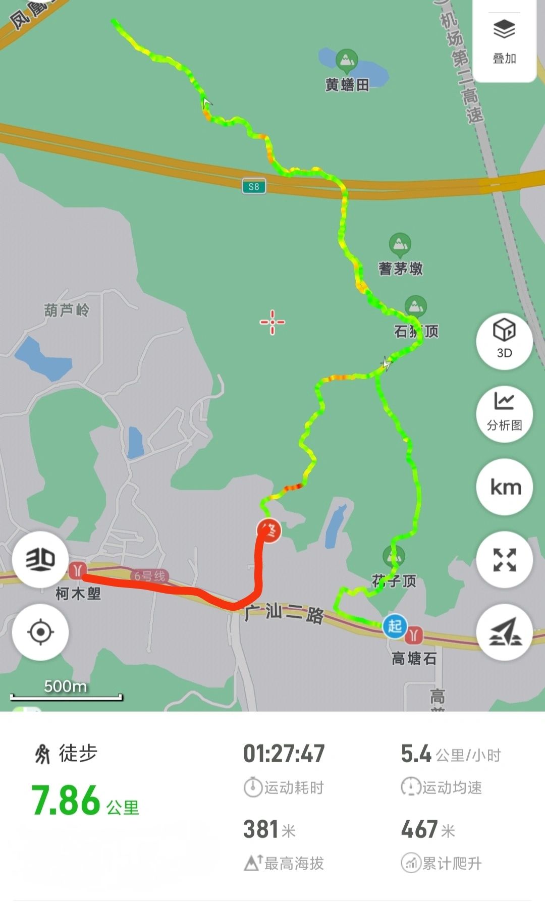 冲顶:凤凰山(有各种小吃,冰水)打卡完后原路下山,选:上涂幼儿园路口,终点:柯木塱C1口。
