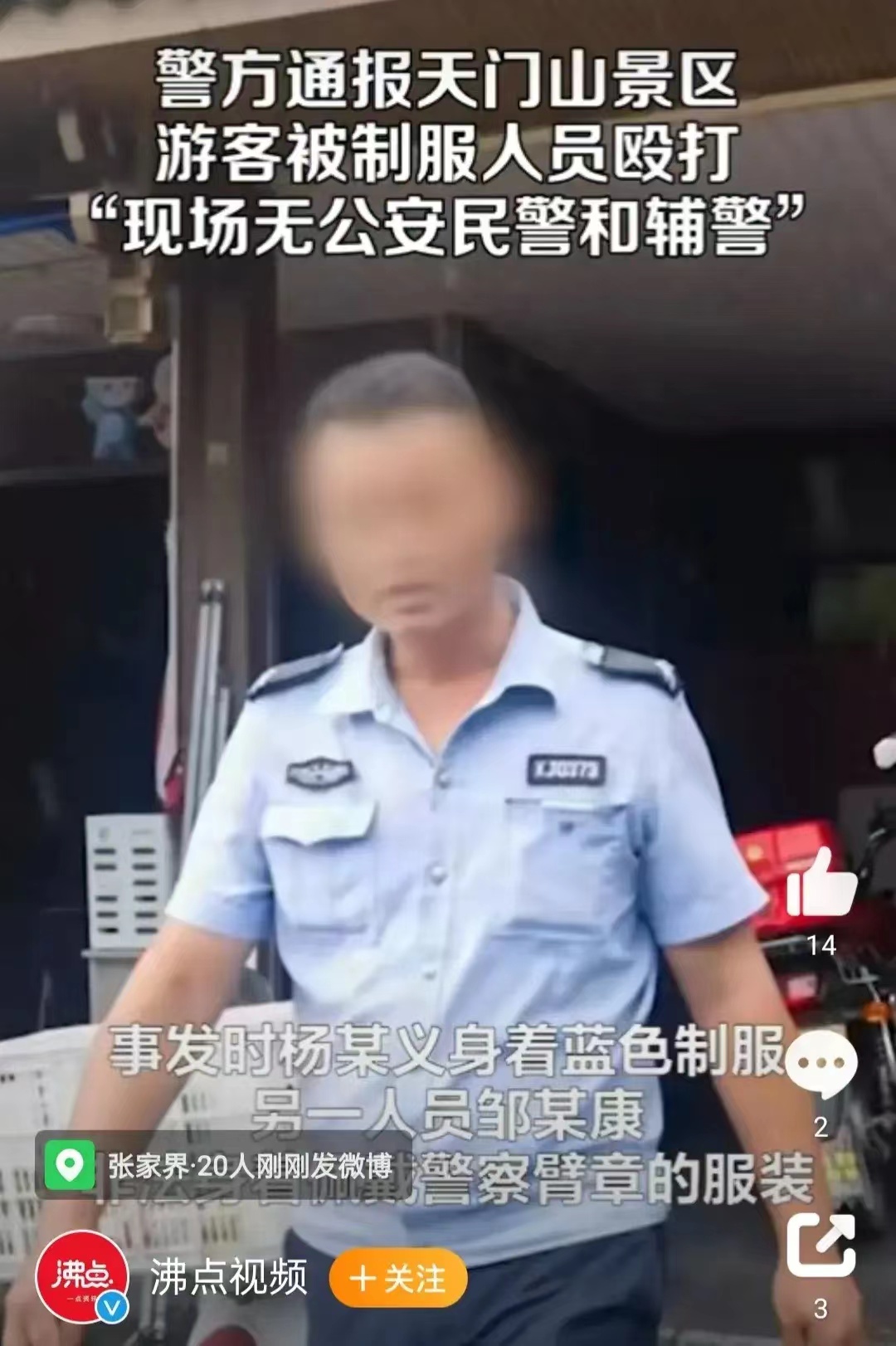 现在湖南张家界天门山所属景区的公安部门通报,打人现场没有警察和辅警,其中身着所谓警察制服的是保安,而且是从网上私自购买的,编号也是网上买的假编号。公安机关已对殴打他人的杨某义、覃某和非法穿着佩戴警察臂章服装的邹某康依法行政拘留,案件正在进一步办理中。