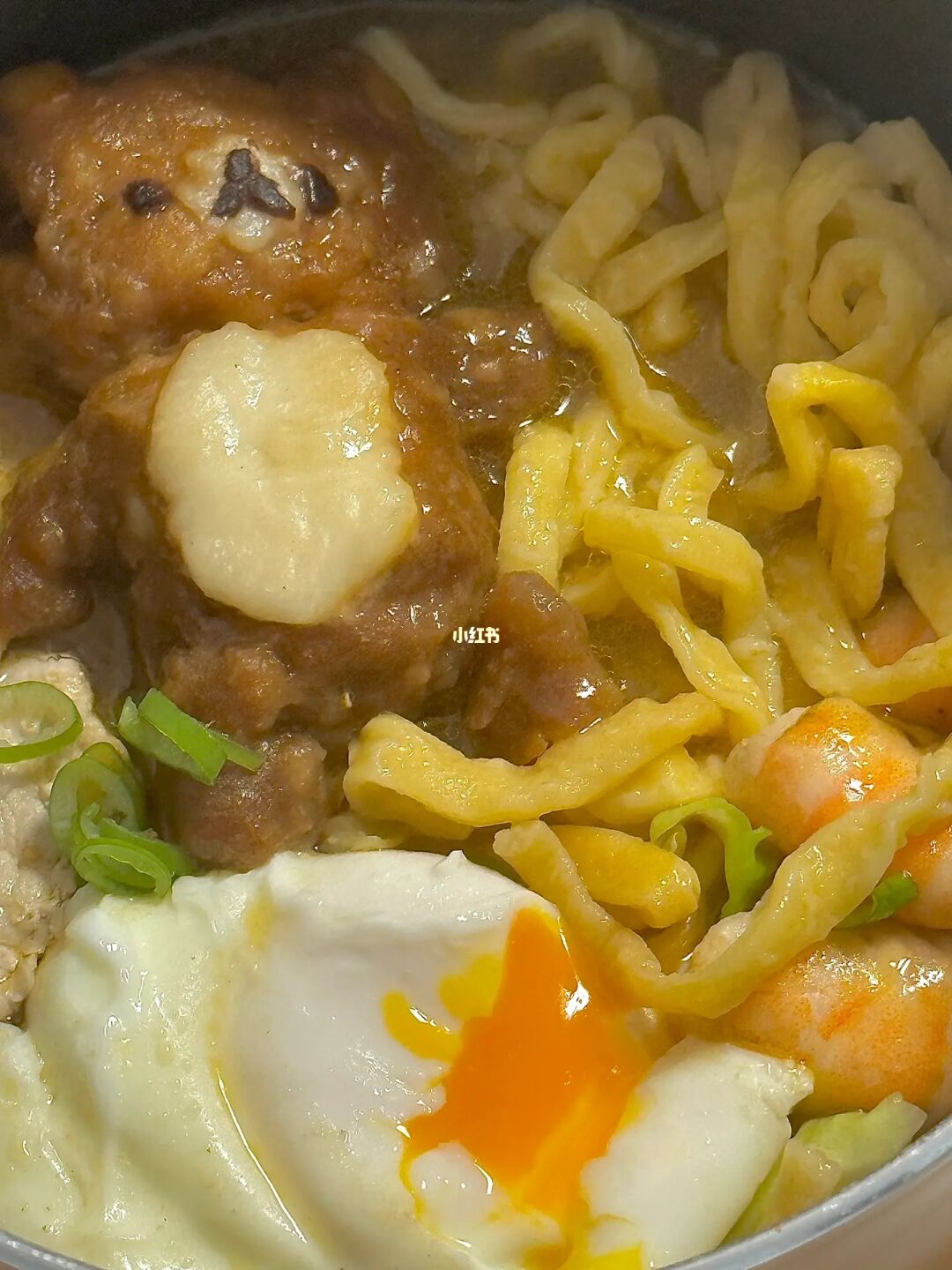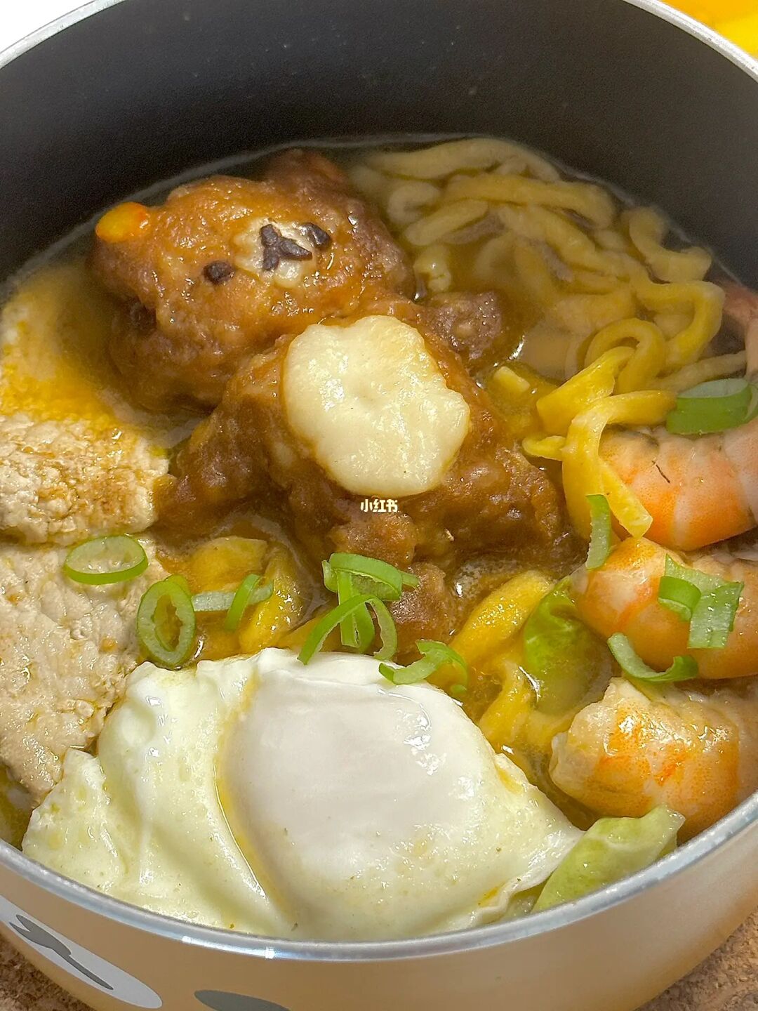 5.虾熟了以后加入刚刚的面和白菜和鸡蛋(这里我怕溢锅我另外起锅煮的鸡蛋,大家也可以这样),白菜煮熟后放入鱼丸再焖煮一分钟,撒葱花