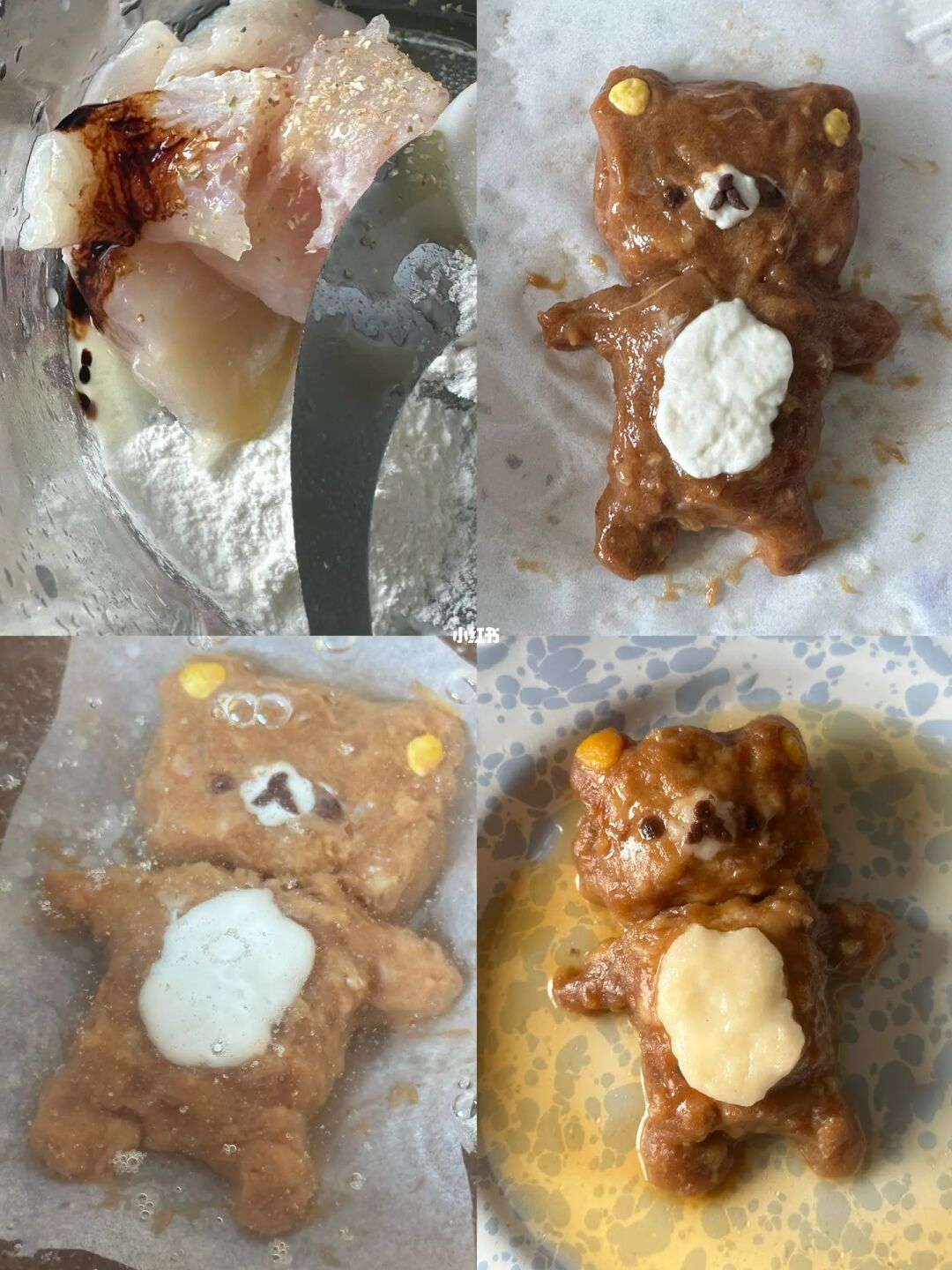 3.鱼丸配料混合打匀,在烘焙纸上做成熊熊形状,贴上表情,锅子里小火煮熟,捞出备用